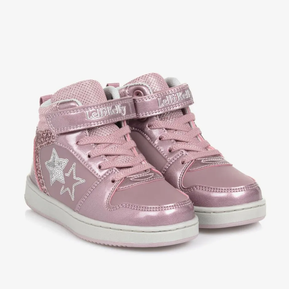 Pretty pink high top trainers for girls by Lelli Kelly, with shimmering sequin stars on the sides. Made in soft faux leather with metallic and glitter panels, they have a silver logo on the velcro strap and a rose logo on the heels. The soft, padded tongue also glitters with silver. They have a comfortable fabric lining, a lightly padded insole and a non-slip rubber outer sole. Pink elasticated laces ensure the trainers are easy to pull on.
