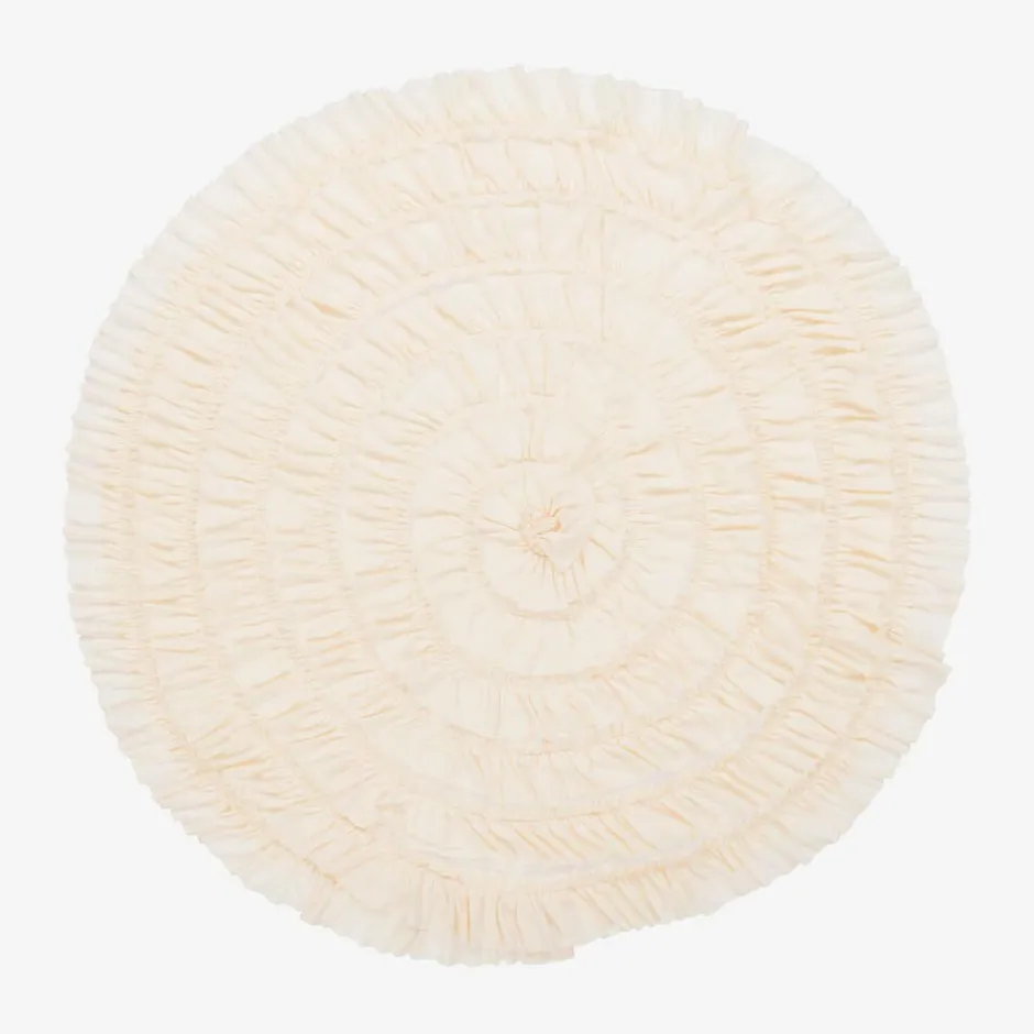 Ivory blanket for baby girls by Lemon Loves Layette, made from beautifully soft Pima cotton jersey. In a round shape, this lovely blanket is covered with gorgeous spiralling ruffles. Ideal for use when out and about as a lightweight, yet cosy cover, or in the nursery as a comfortable area to lay baby on.