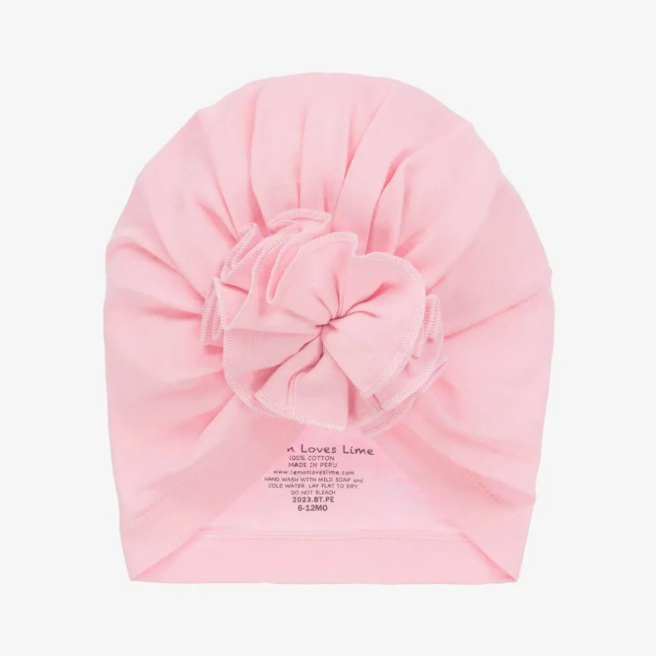 A pink turban hat for baby girls by Lemon Loves Layette, made in beautifully soft Pima cotton jersey. This lightweight hat is gathered at the front with a floral rosette for a pretty finish.