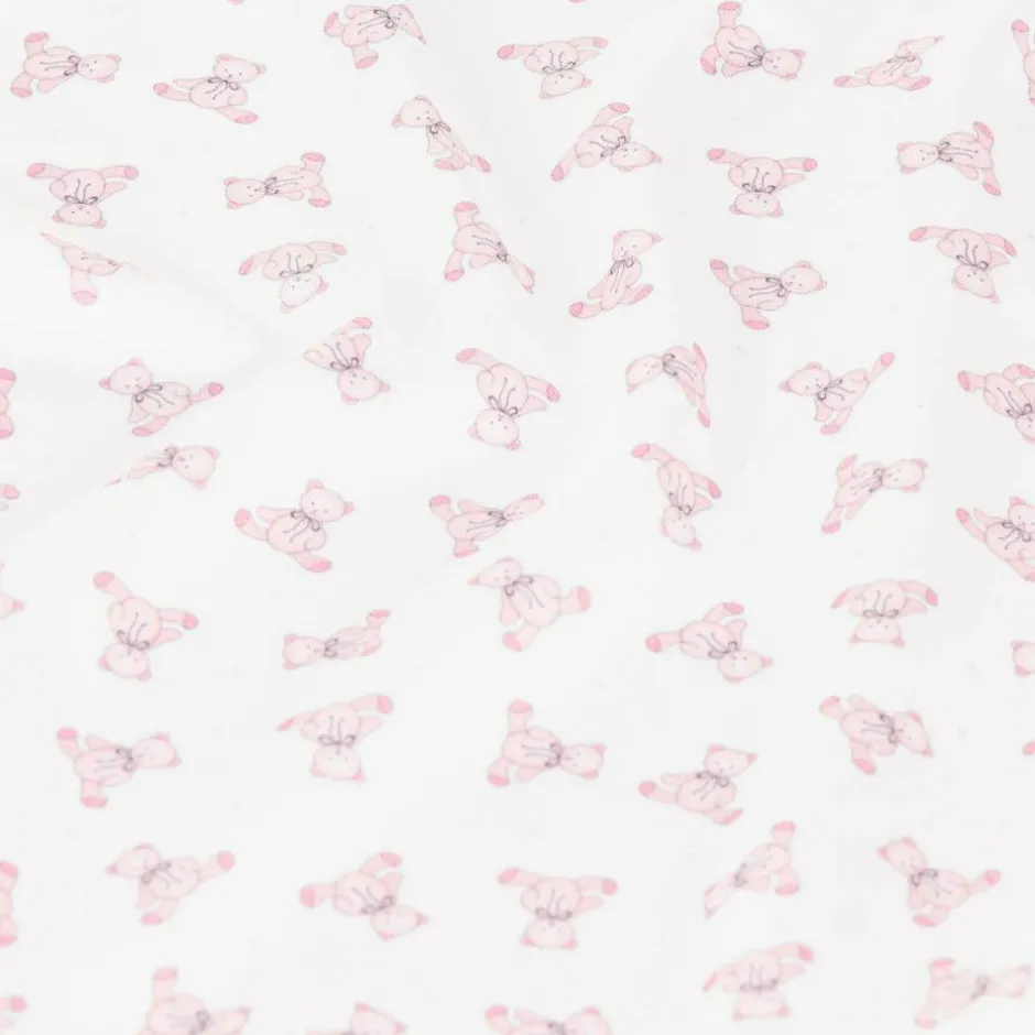 Sweet white and pink blanket for baby girls by Magnolia Baby, made in luxuriously soft Pima cotton jersey. Ideal for the nursery, this beautifully decorated blanket has charming pink teddy bears all-over and a pink stitched border.