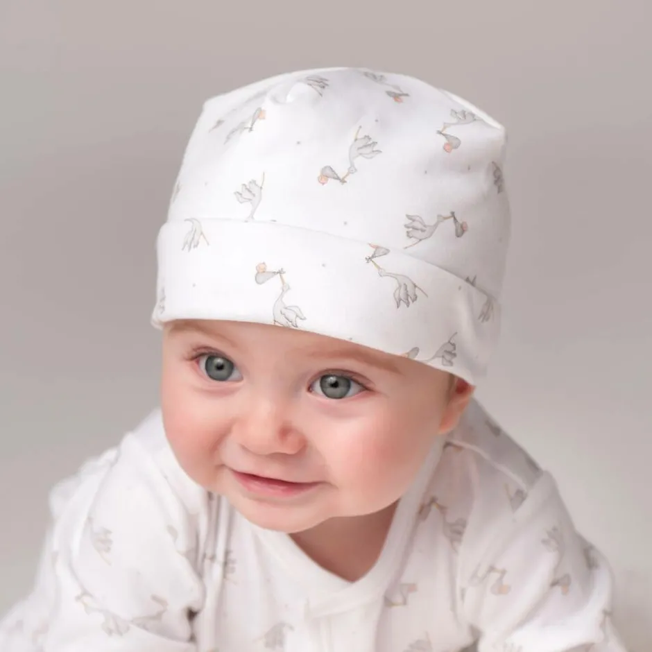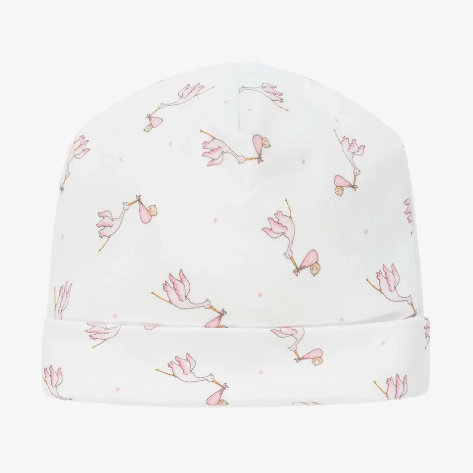 Baby girls white super soft Pima cotton hat by Magnolia Baby. Made with a double layer of jersey, it has a pink stork print with a turned up brim.
