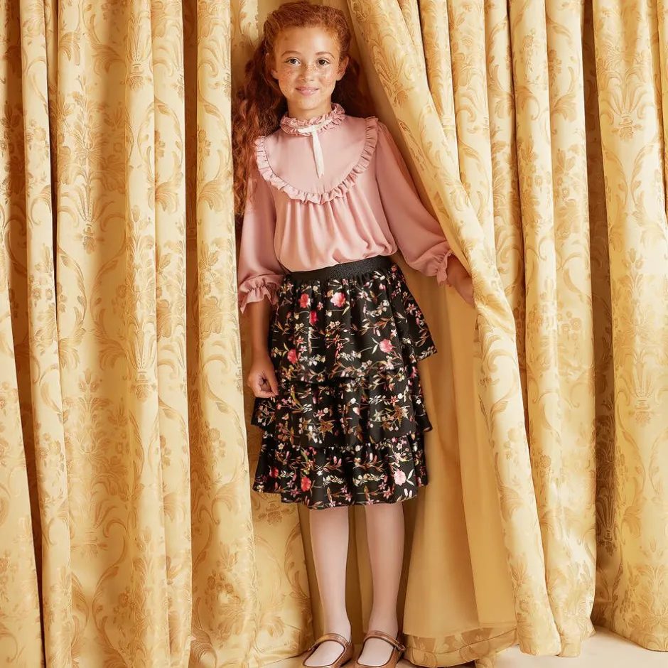 Girls rose gold ballerina pumps with brown trims by Manuela de Juan, handmade in soft leather. In a pretty Mary Jane style, they have a soft leather lining, popper fastening and a rubber sole.