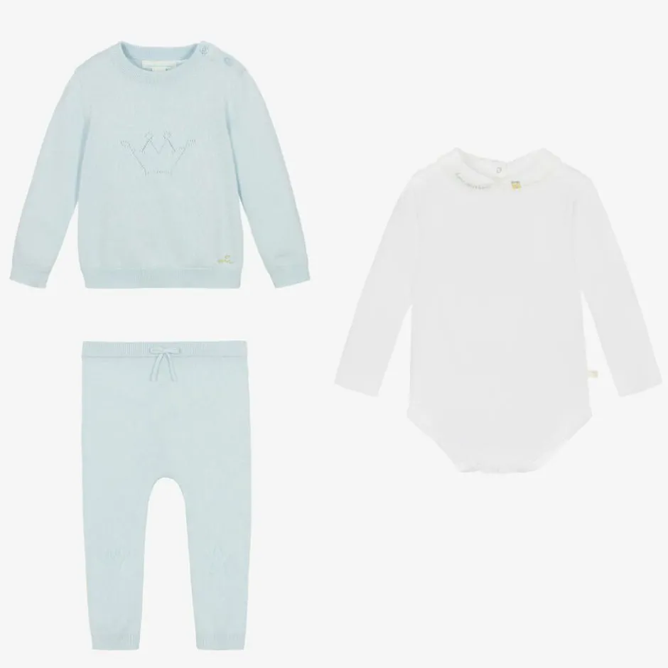 Lovely pale blue knitted trouser gift set for baby boys designed by the Greek princess Marie-Chantal. It is made in a luxuriously soft cotton and cashmere blend with cosy ribbed trims. The sweater has a cutwork crown on the front, with a shiny gold logo embroidered by the hemline and fastens with useful logo buttons on one shoulder. The trousers have a matching crown and star on the knees and a faux drawstring on the elasticated waistband, just right for little tummies. They come with a super soft Pima cotton jersey bodysuit, with a poplin Peter Pan collar that is beautifully embroidered with 'Home Sweet Home' and a little house in yellow and blue.