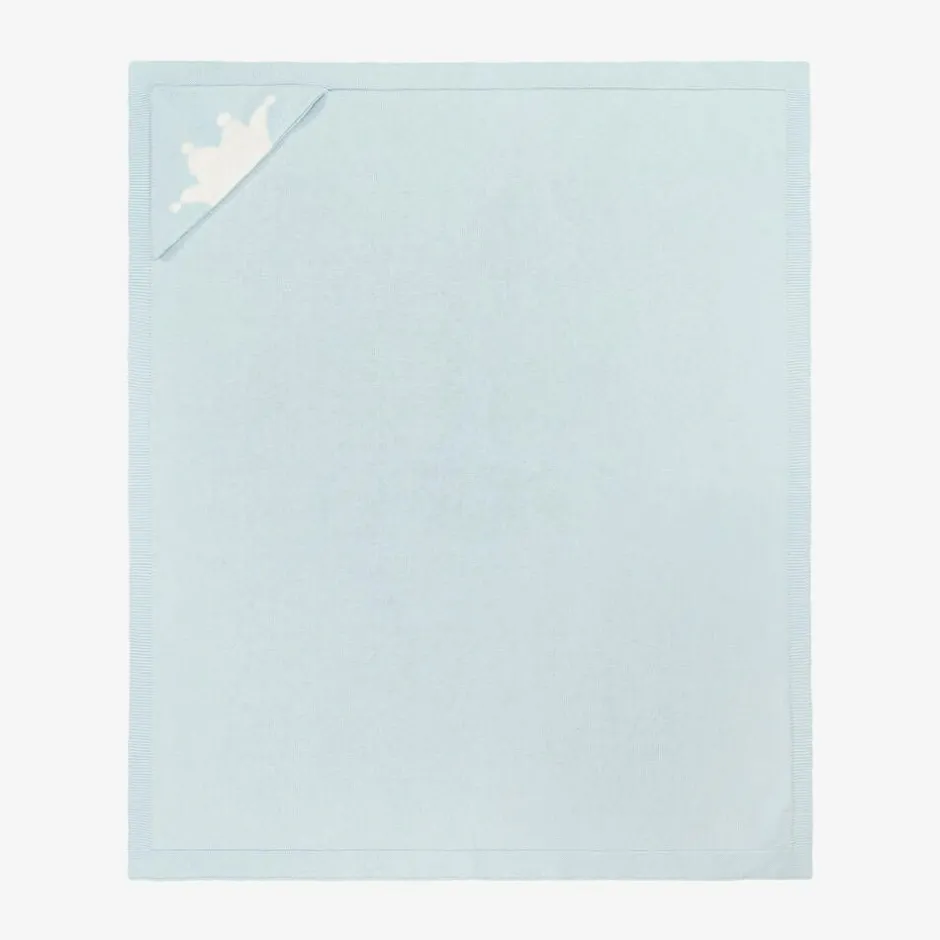 Pale blue blanket for baby boys and girls by Marie-Chantal, with the designer's signature Tino Crown motif on the hood. Knitted in a luxuriously soft cotton and cashmere blend, this lovely blanket is ideal for wrapping baby and keeping them cosy and warm.