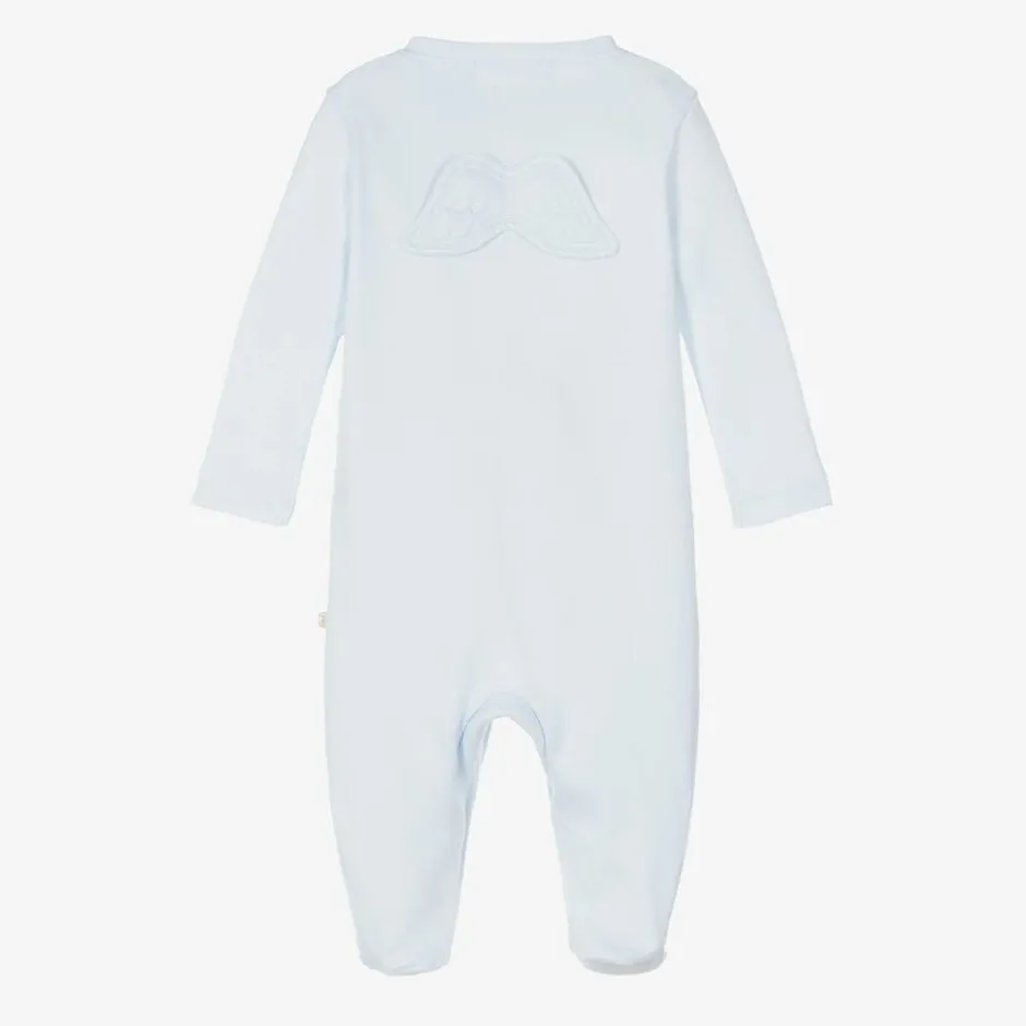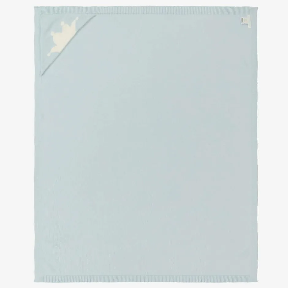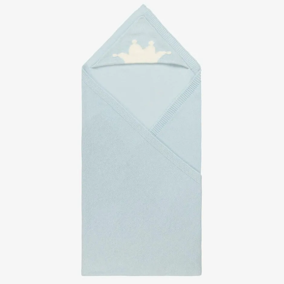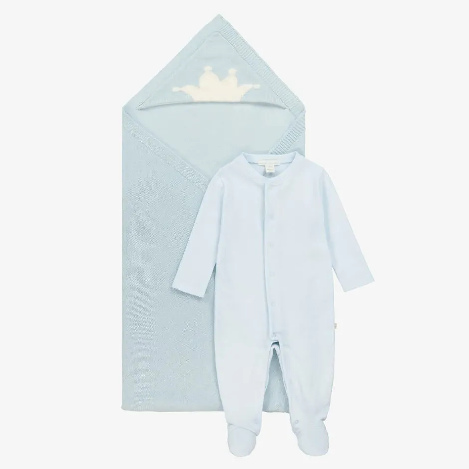Lovely blue super soft Pima cotton babygrow and shawl gift set for baby boys, designed by the Greek princess Marie-Chantal. The babygrow is made in comfortable pointelle jersey, with the brand's signature Angel Wings on the back, padded and embroidered. It fastens with easy-to-use poppers on the front and between the legs. It comes with a beautifully soft, knitted cotton and cashmere blend shawl, that has a corner hood patterned with a white intarsia crown.