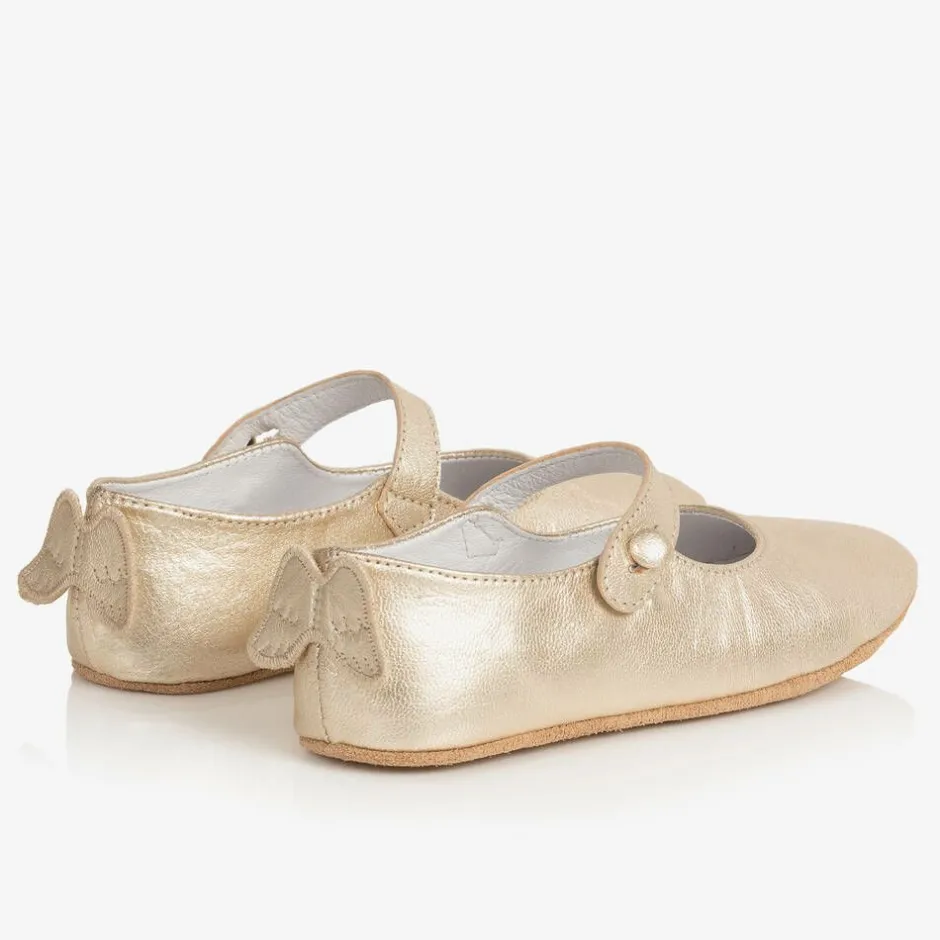 In a lovely shade of pale gold, these classic Mary Jane shoes for girls are by Marie-Chantal. They are made in luxuriously smooth leather with suede leather soles, and trimmed with the designer's signature Angels Wings at the back. Lightweight and comfortable, they secure on the foot with a button fastening strap.