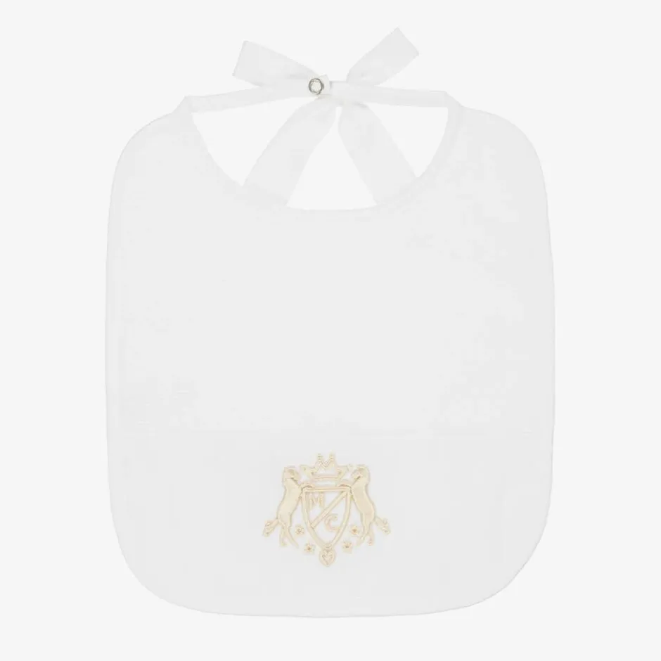 Lovely white bib for baby boys and girls by Marie-Chantal, made in soft cotton. The front is made in towelling and cotton sateen, with the brand's heritage crest embroidered in ivory. It is lined in soft cotton and has a popper fastening on the back with a pretty bow.