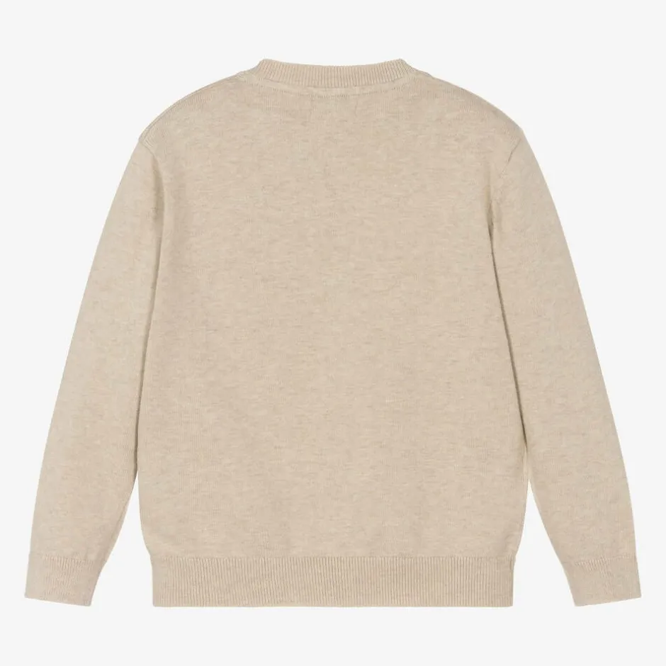Beige cotton sweater for boys by Spanish brand Mayoral, finely knitted in soft cotton. Great for layering, this lightweight top has comfortable ribbed trims and a faux leather logo patch sewn by the hemline.