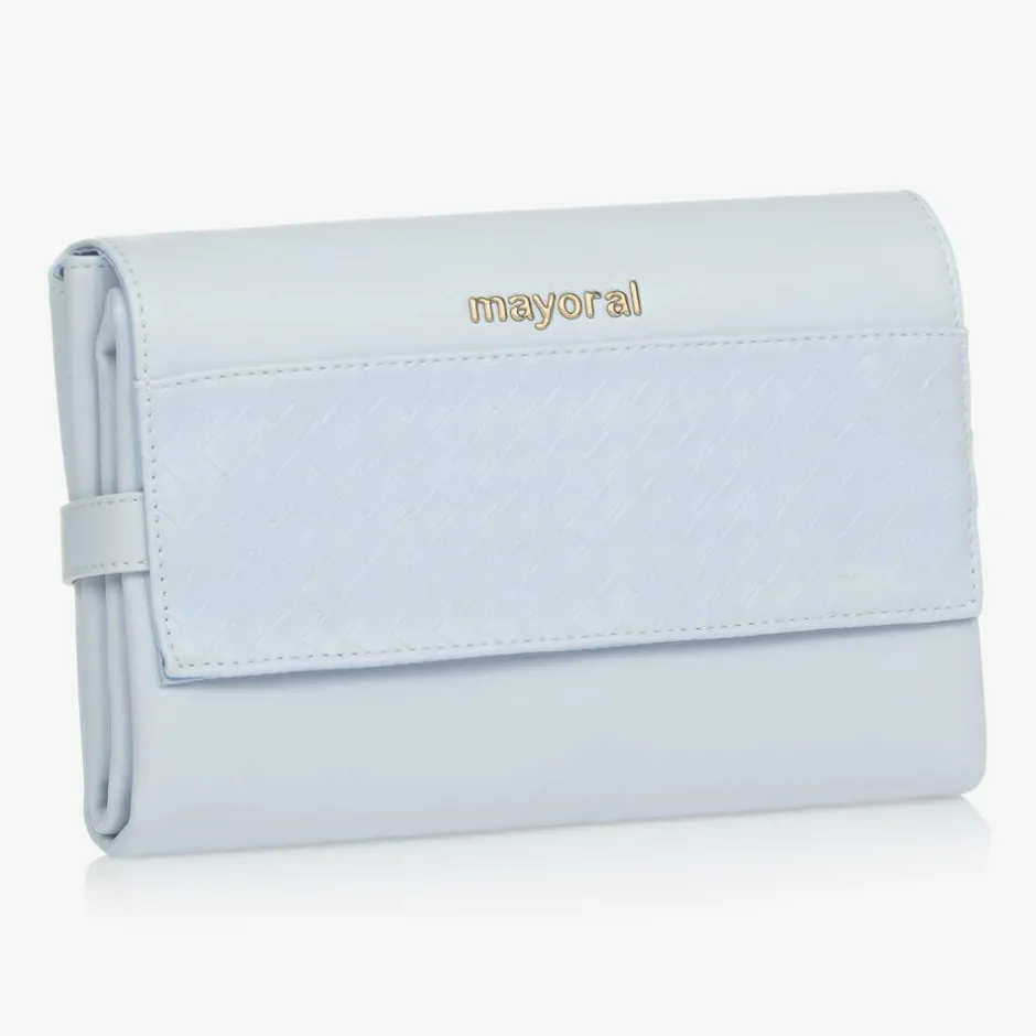Lovely pale blue foldable changing mat for baby boys and girls by Mayoral. Fastening with velcro on both sides, it is made in soft faux leather with a silky lining and light padding for baby's comfort. Lightweight and practical on the go, it folds up easily into a compact size to slip into a buggy pocket or a changing bag and has a zipped back for pocket. The front flap has an embossed weave pattern and a golden logo branding.
