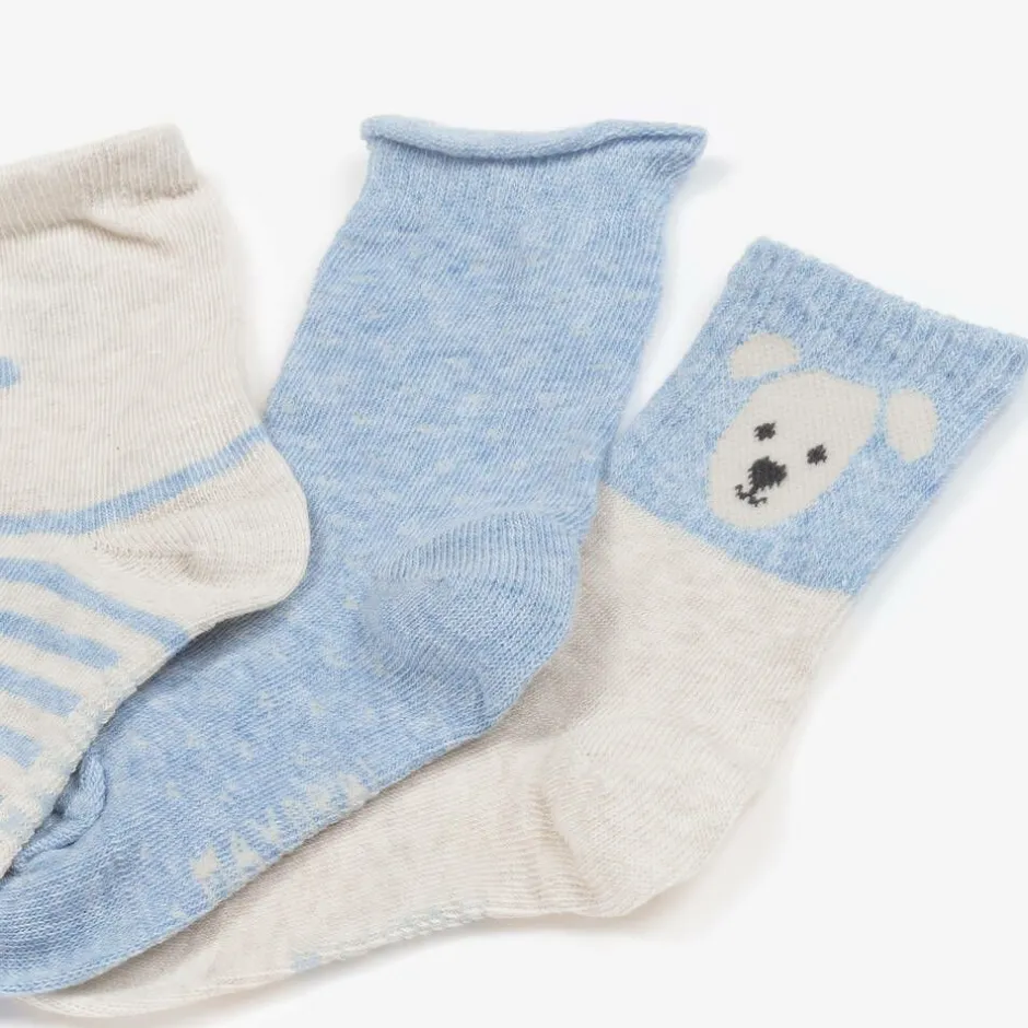 Three pairs of pale blue and ivory socks for little boys by Spanish brand Mayoral, with puppy faces, stripes, and polka dots. They are made in a soft cotton blend. These socks contain organic cotton.