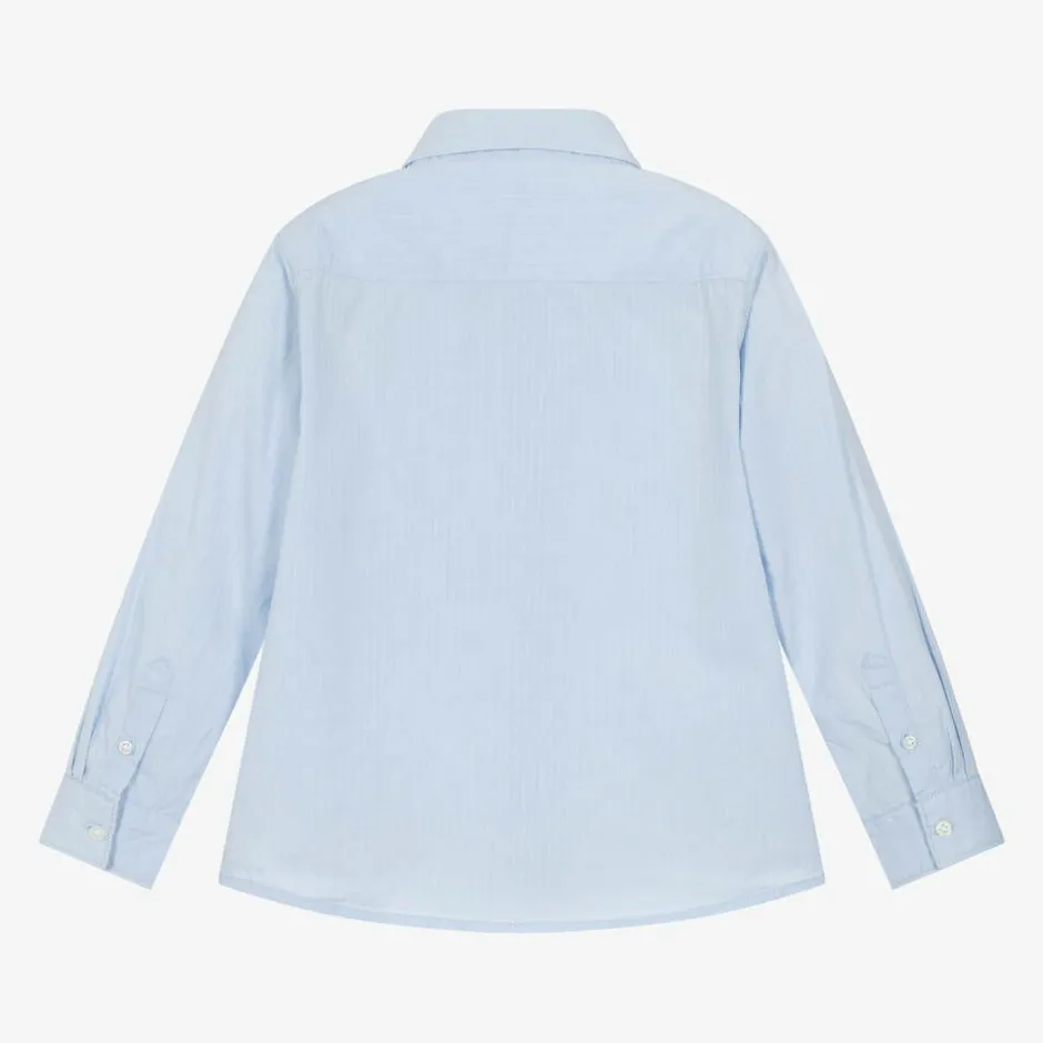 Smart blue shirt for boys by Mayoral, made in soft and lightweight cotton. Slim-fitting, it has a tonal pinstripe design and pearlescent button fastenings on the front and the cuffs. To accessorise the look with a timeless touch, it comes with a clip-fastening grey tie.