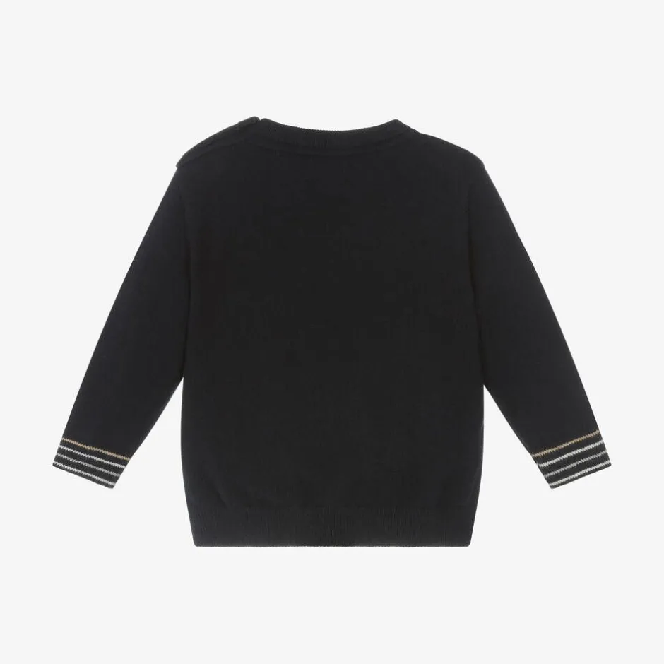 Cosy and comfortable for little boys, this navy blue sweater is by Mayoral. Knitted in a soft blend of cotton and wool, it has striped ribbed cuffs, and features a trio of vintage racing cars on the front. There are button fastenings on one shoulder to help with dressing.