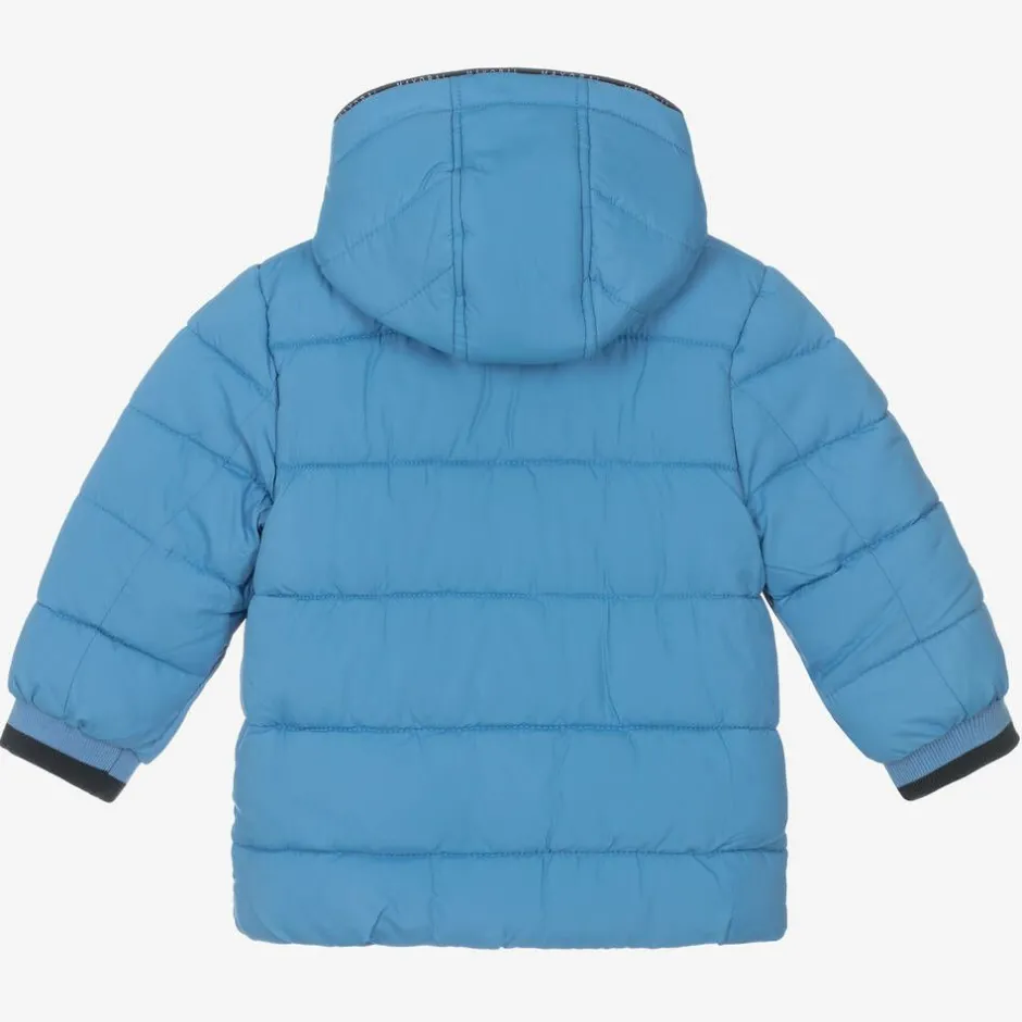 A blue puffer coat for little boys by Mayoral, made in a smooth matte fabric with a soft polar fleece lining. Fastening at the front with a zip and poppers, this functional coat has a detachable hood that zips on and off easily. It has front pockets with ribbed trims on the sleeves and interior hem to keep them warm. A rubberised logo is featured on one sleeve and there are navy blue branded edges on the hood and front.