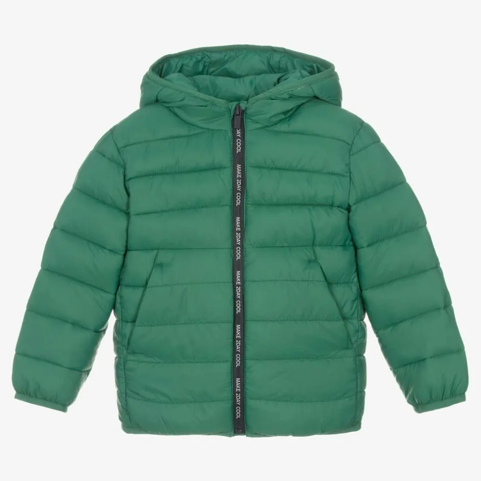 Green puffer jacket for boys by Mayoral, with a fixed hood. Made in silky smooth fabric and lightly padded, it provides warmth without the weight. For a cosy fit and to help keep out chilly winds, it is gently elasticated around the cuffs and hem, and has a taped front zip fastening with a repeat slogan print.
