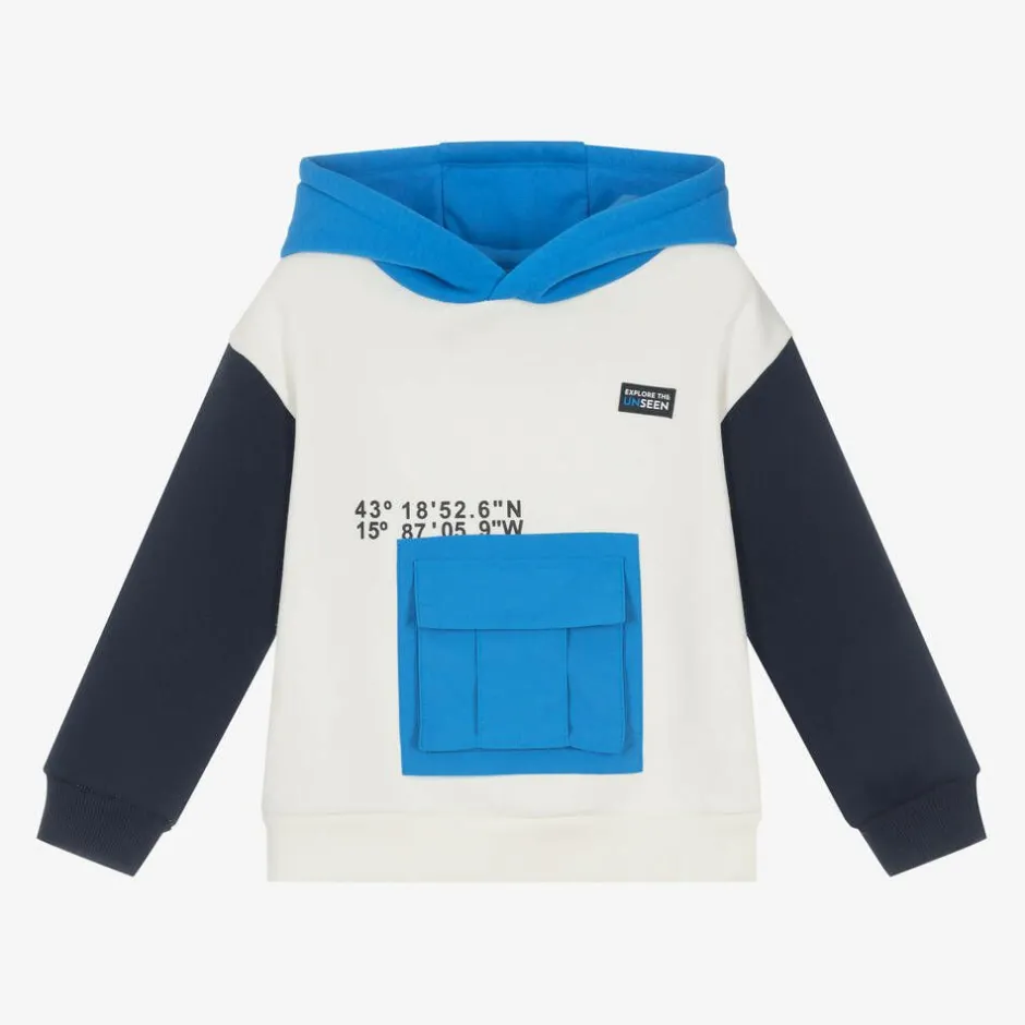 Boys hoodie by Spanish brand Mayoral, in an ivory, navy blue and bright blue colourblock. Soft and fleecy on the inside, it is made in mid-weight cotton blend jersey with ribbed trims and a cool utility-style pocket with velcro on the front. It has graphic geographical coordinates and an 'Explore the Unseen' rubber patch on the chest.