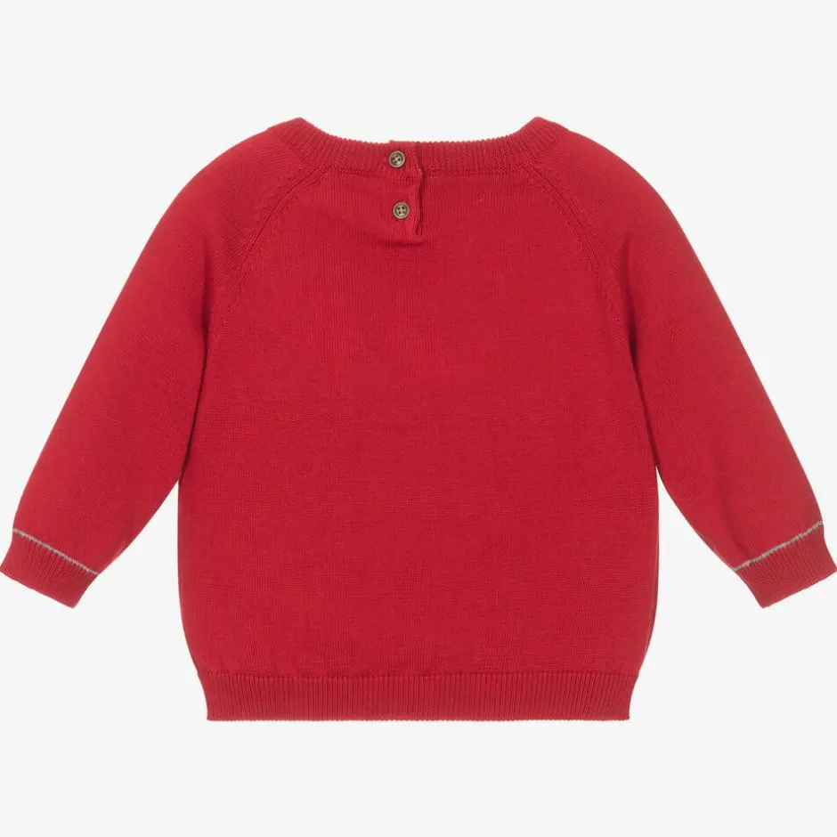 A timeless classic, this simple red cotton sweater for little boys is by Mayoral. Made from a soft knit with ribbed trims, it has a fine grey stripe around the cuffs and button fastenings on the back for a neat finish.