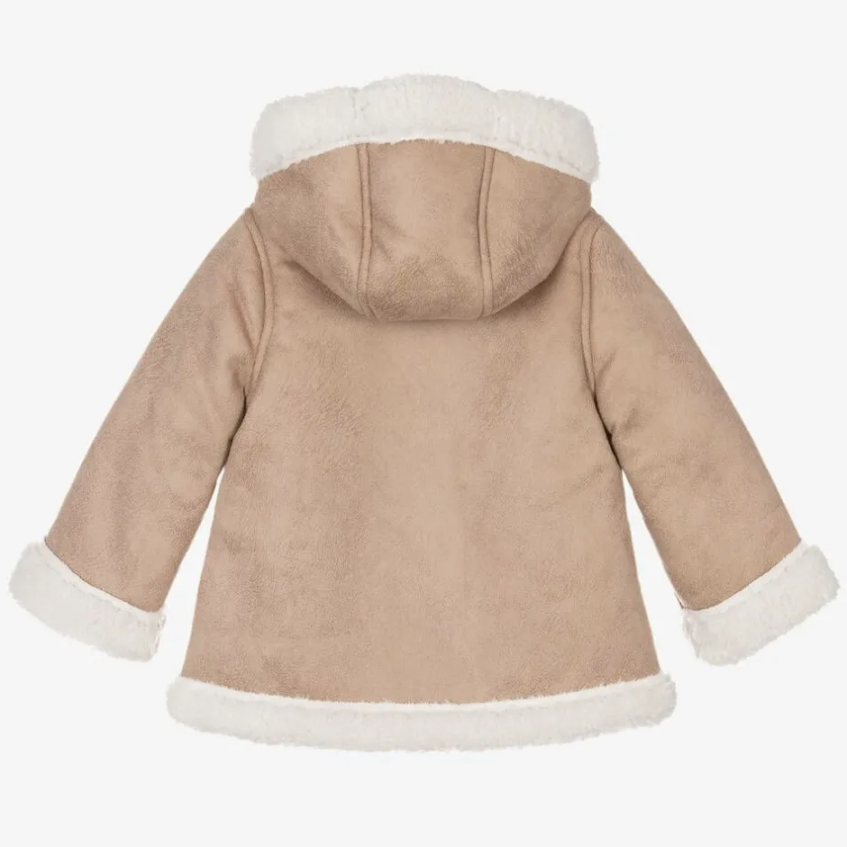 Charming dark beige coat for little girls by Mayoral, made in soft faux suede. Lined with super soft sherpa fleece, which is visible on the trims for a classic look, this lovely coat fastens with buttons on the front to help keep the warmth in. It has fleece-lined front pockets to keep little hands warm.