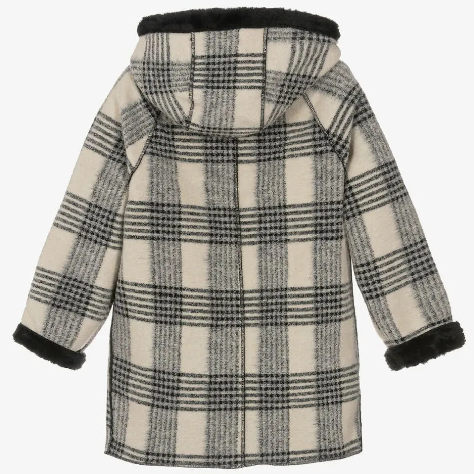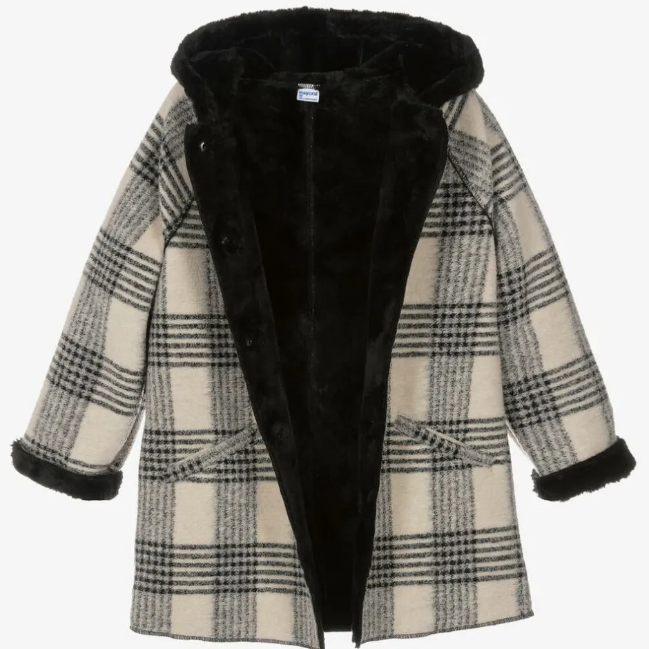 A beige and black check coat for girls by Mayoral, in a super soft brushed fannel feel fabric with a black faux fur lining. Warm in colder weather, this coat has a cosy hood, front pockets and easy-to-fasten poppers on the front.