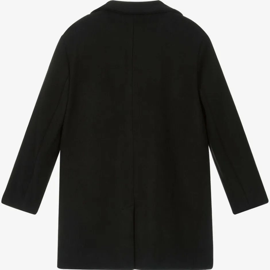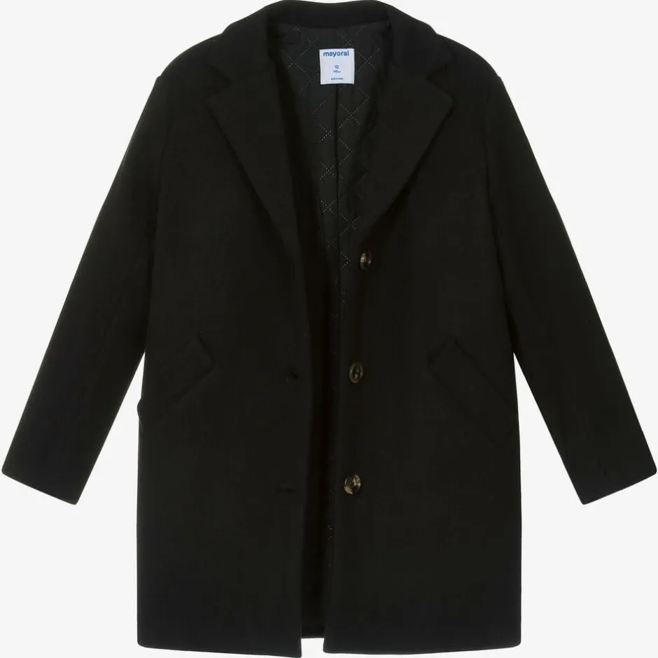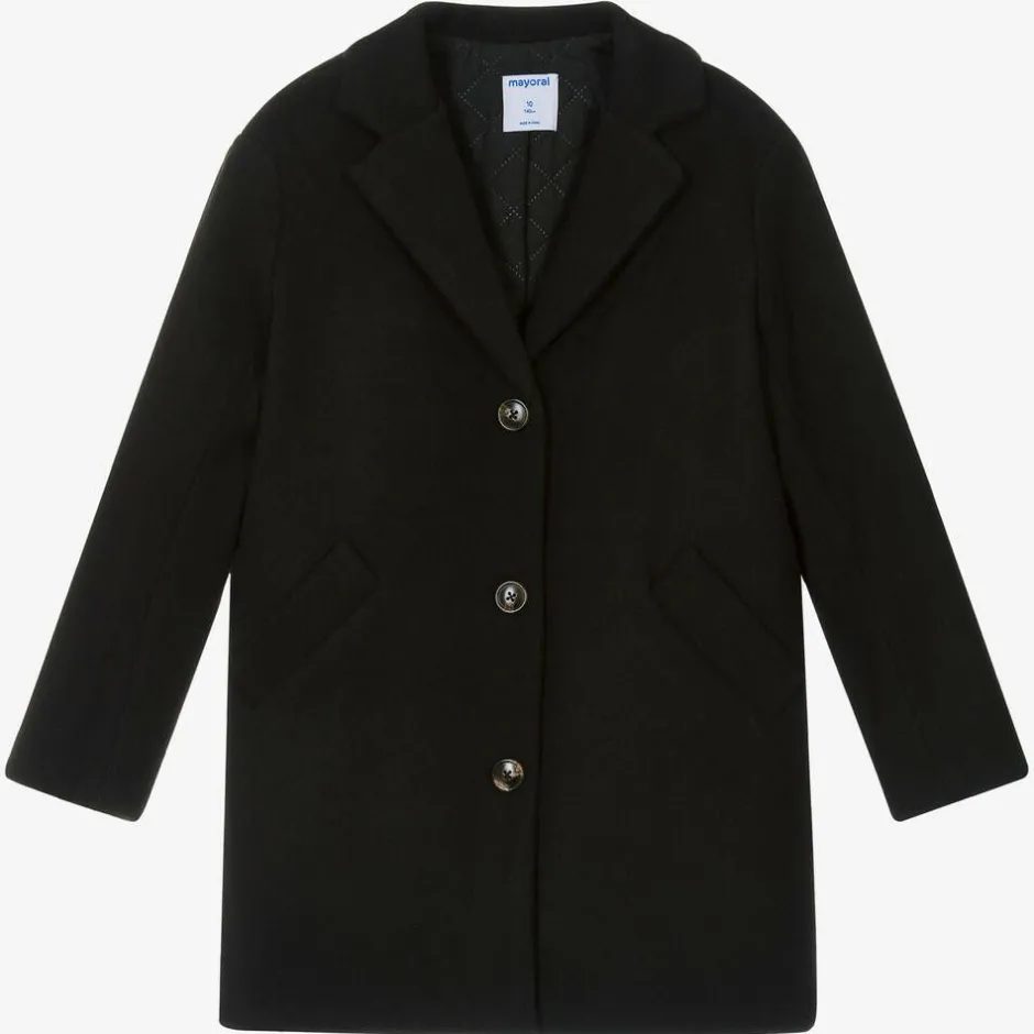 Lovely black felted coat for older girls by Mayoral, with a soft wool feel. Faux tortoiseshell buttons fasten the front in a timeless style. It has a quilted lining for comfort, a vent on the back for ease of movement, and pointed lapels for a smart finish.