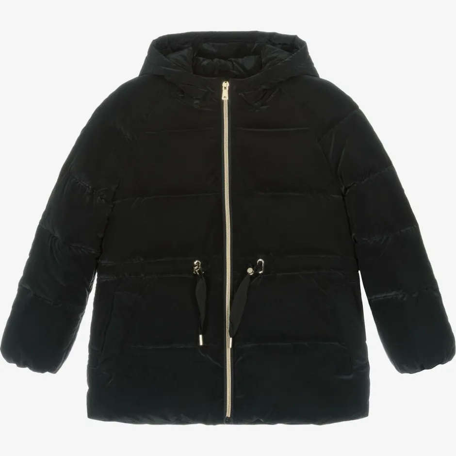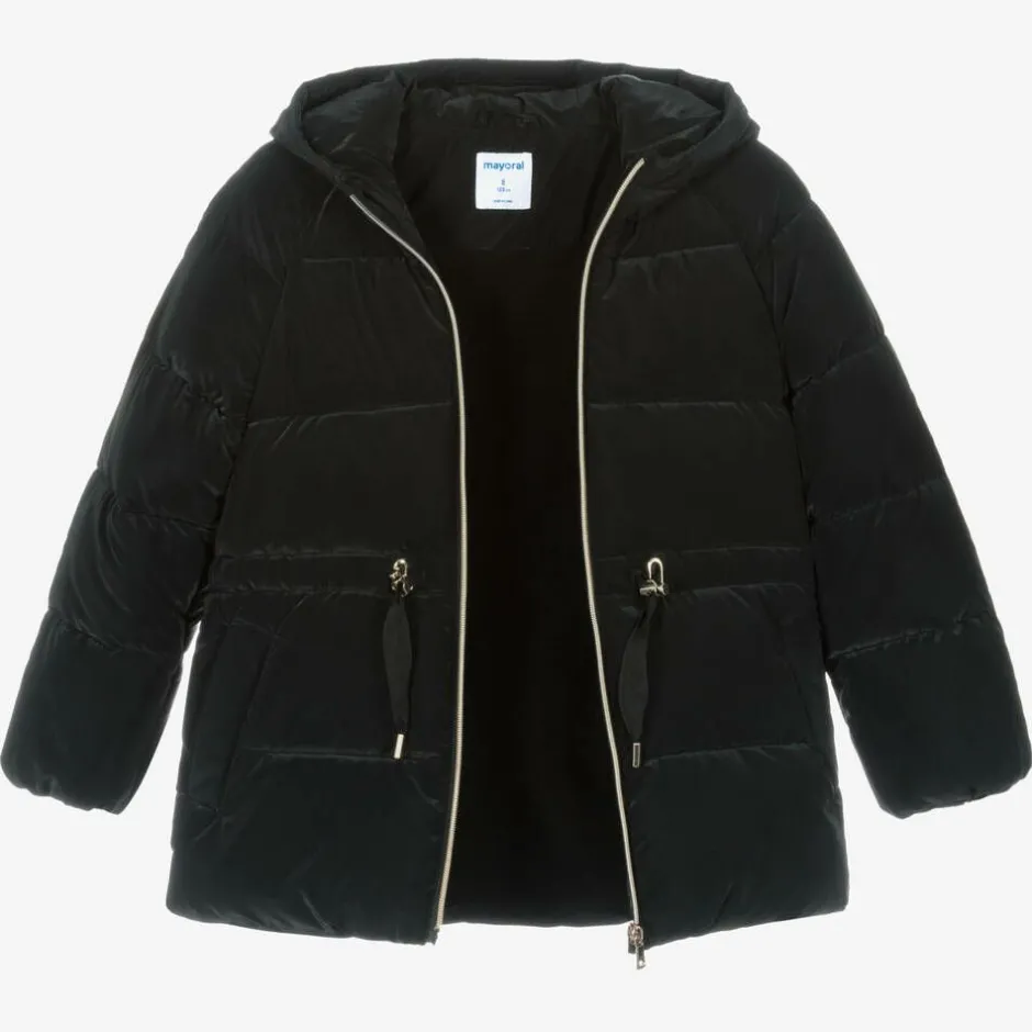 A black puffer coat for older girls from Mayoral, with gold-tone hardware. This hooded coat is made in silky soft fabric and padded with mid-weight insulation for extra cosiness. It has convenient front pockets, a soft polar fleece lining for warmth and a drawstring detail on the waist for the ideal fit.