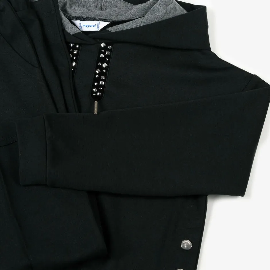 Casual yet stylish, this black hooded tracksuit for older girls is by Mayoral. Made in soft and stretchy jersey, it is easy and comfortable to wear. The top has a grey marl lining inside the hood and is accented with silver-tone metal detailing on the chest and sides. The joggers have large front pockets and are stylishly seamed down the front, with an elasticated waist for an ideal fit.