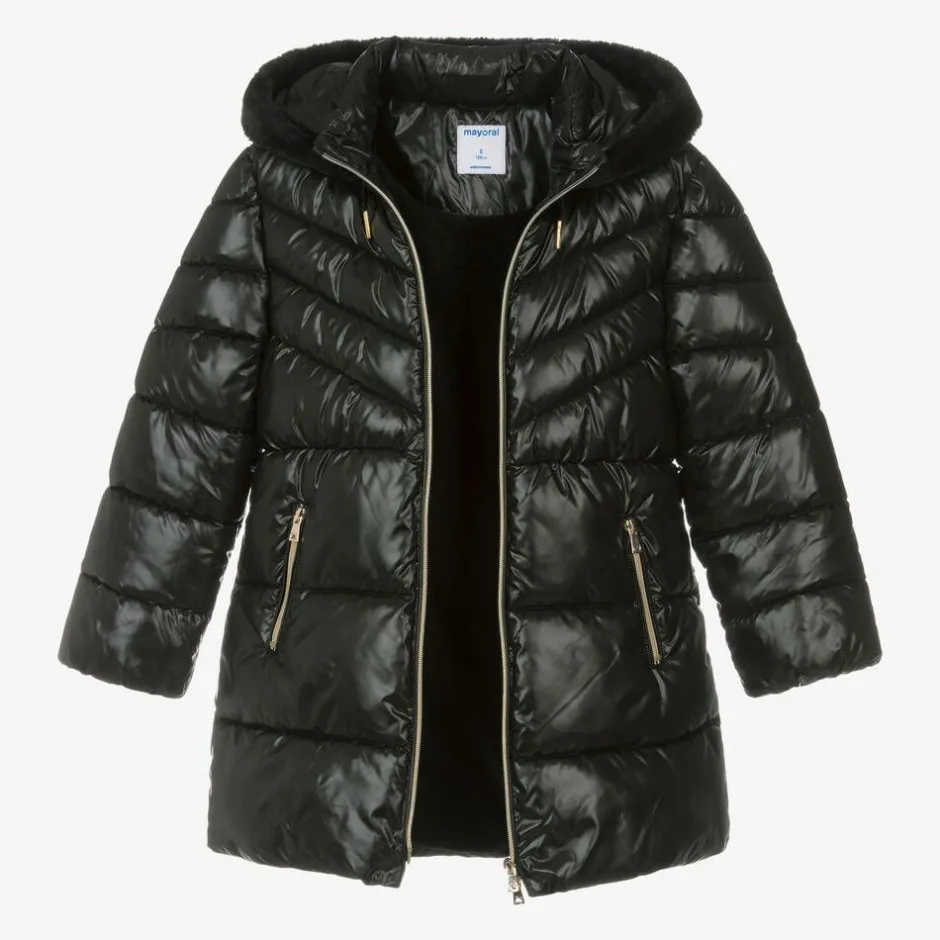 A black puffer coat for older girls by Mayoral, made in silky fabric. This cosy layer has a velvet-feel plush lining and lightweight padding for warmth. Zipping up on the front with a golden zip, it has decorative velvet drawstrings on the hood, a stylish faux fur trim, and elasticated cuffs. The zip-up side pockets are lined with plush, cosy for her hands on cold days.