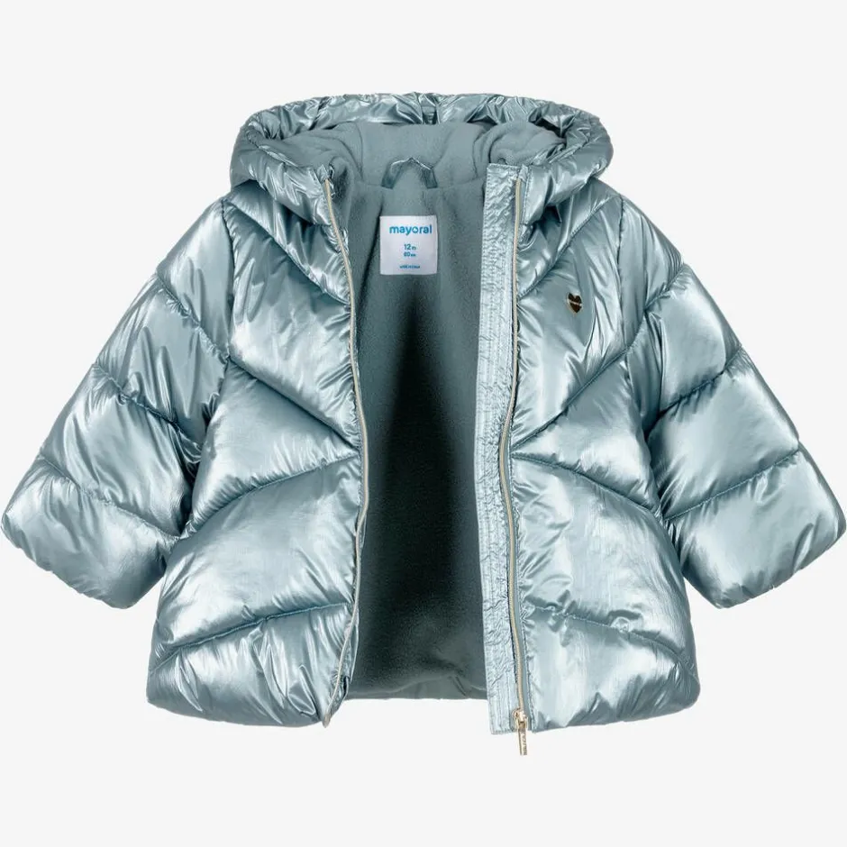 A dusky blue puffer coat for little girls by Mayoral, in a silky smooth, shimmery fabric. This cute coat has a gold zip fastening, a heart-shaped logo charm and elasticated cuffs. It has a hood and a cosy polar fleece lining to keep your little one warm in colder weather. This product contains recycled fibres.