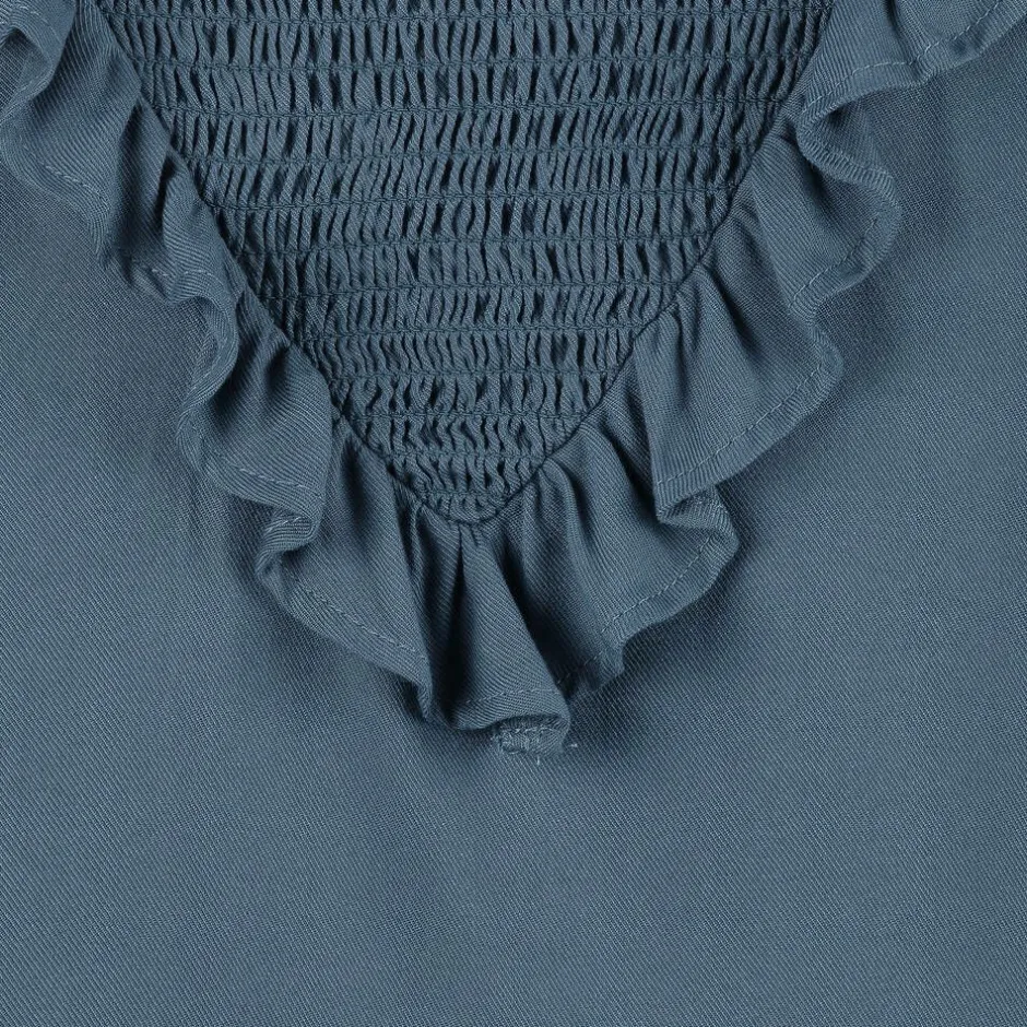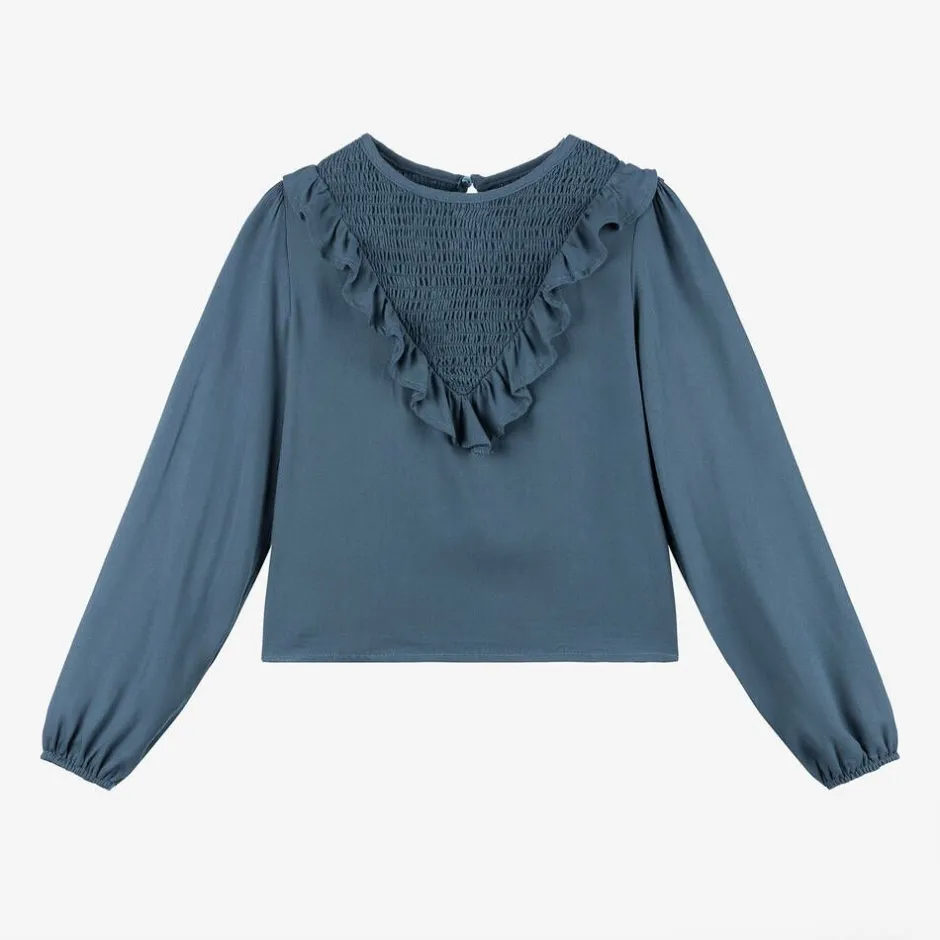 Pretty blue blouse for older girls by Mayoral, made in soft viscose twill. There is a frill on the front and over the shoulders, with shirred panels front and back. The long sleeves have elasticated cuffs and there is a single keyhole button fastening on the back.