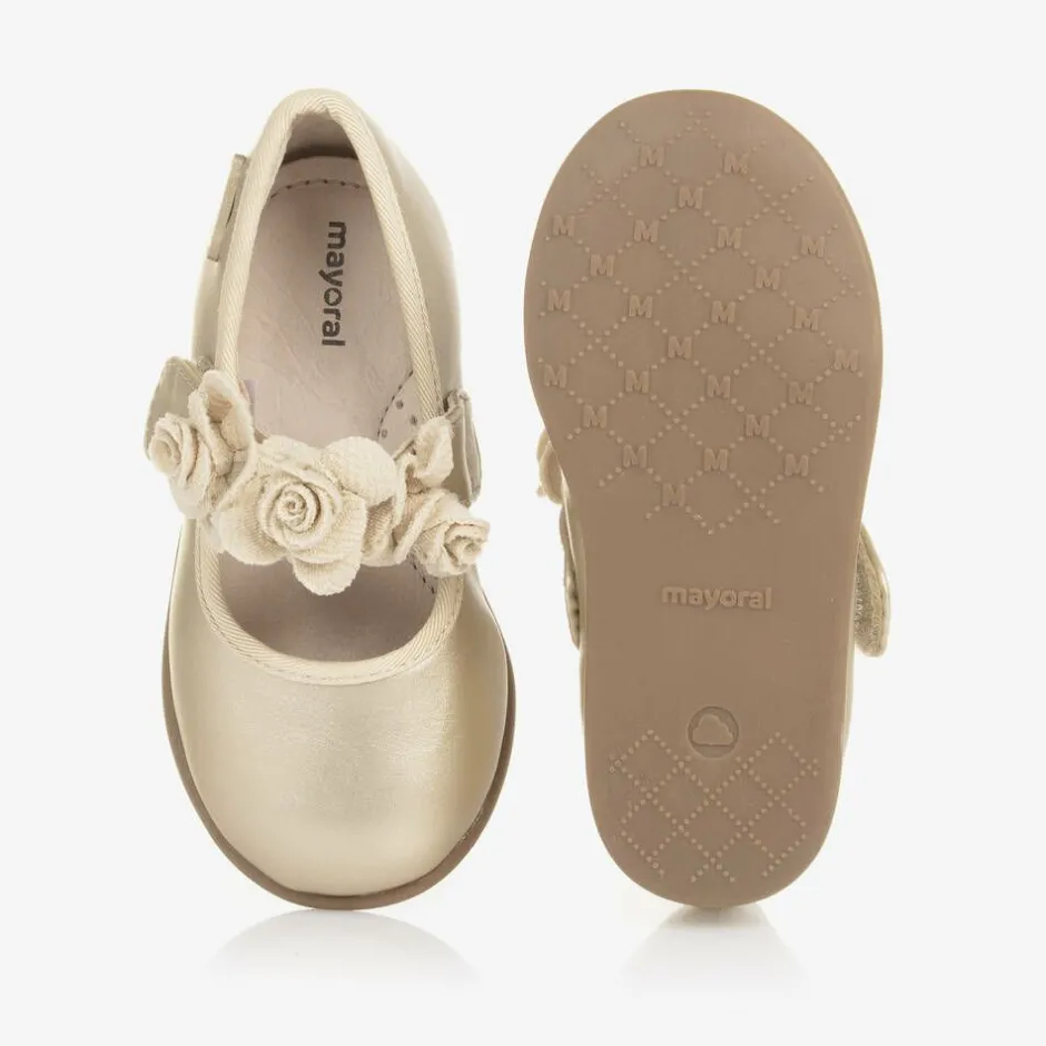 A lovely pair of shoes for little girls by Mayoral, in matte gold with a subtle shimmery finish. Made in soft faux leather, this pretty style is trimmed with tonal fabric flowers on the velcro-fastening strap and a metal logo plate on the heel. For comfortable wear, they are lined in soft and supple leather with a cushioned leather insole and flexible, non-slip rubber outer sole.