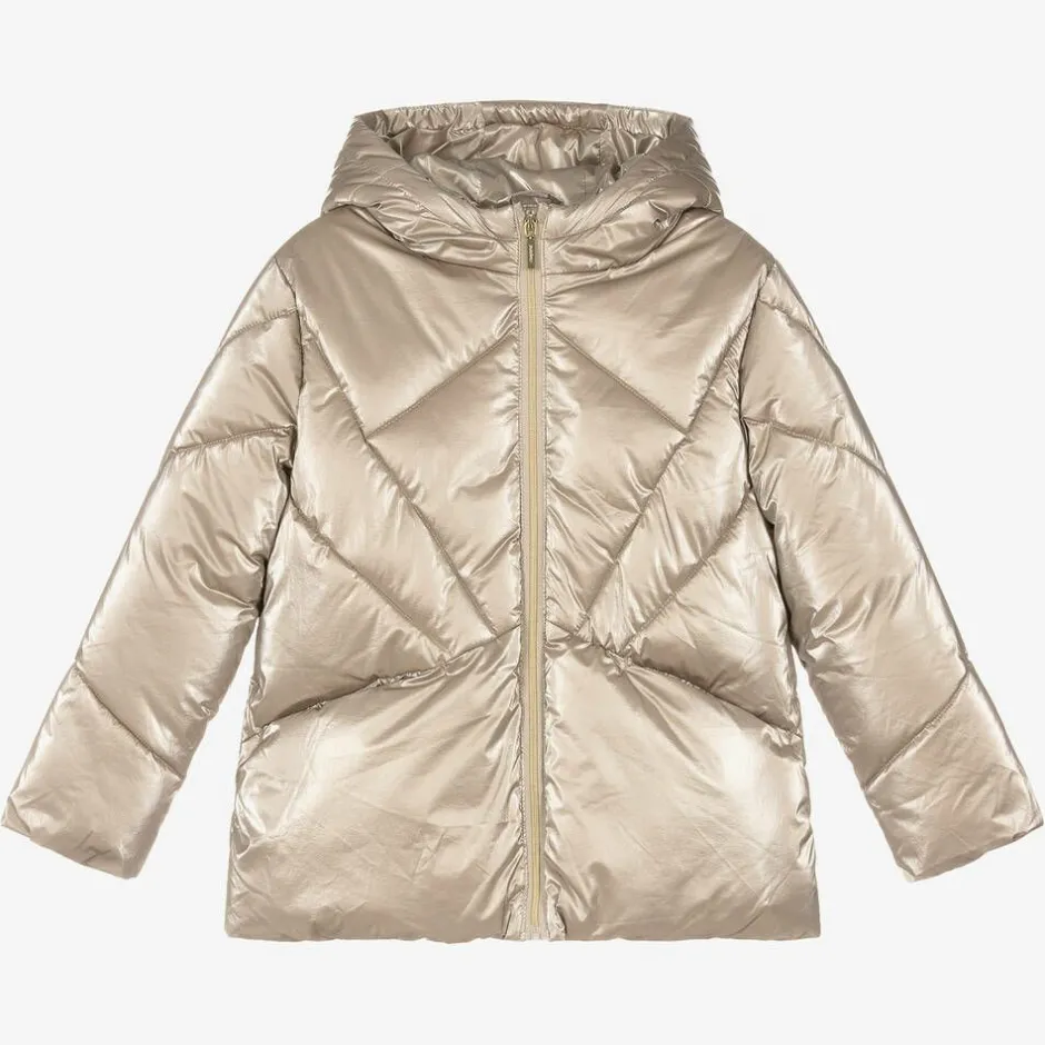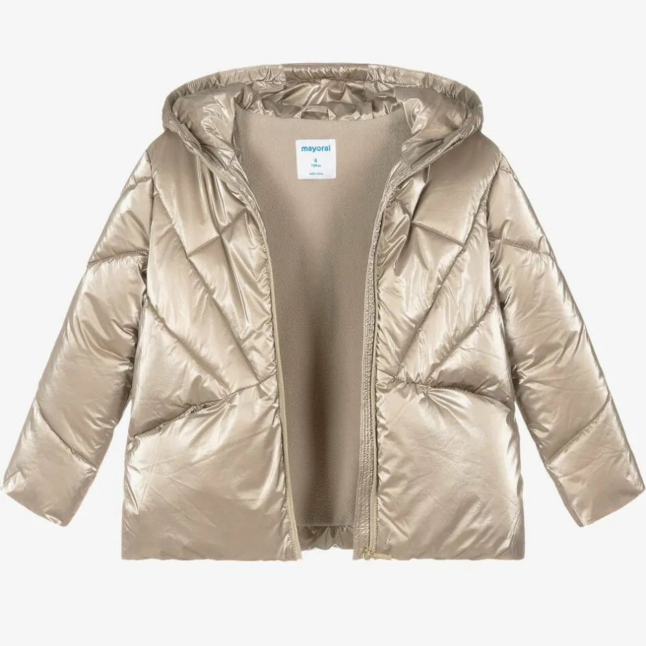 Pretty metallic gold hooded puffer jacket for girls by Mayoral. Silky smooth, it is lined with soft fleece for comfort and has mid-weight padding for added warmth. This cosy coat has concealed pockets on the front and fastens easily with a branded gold zip.