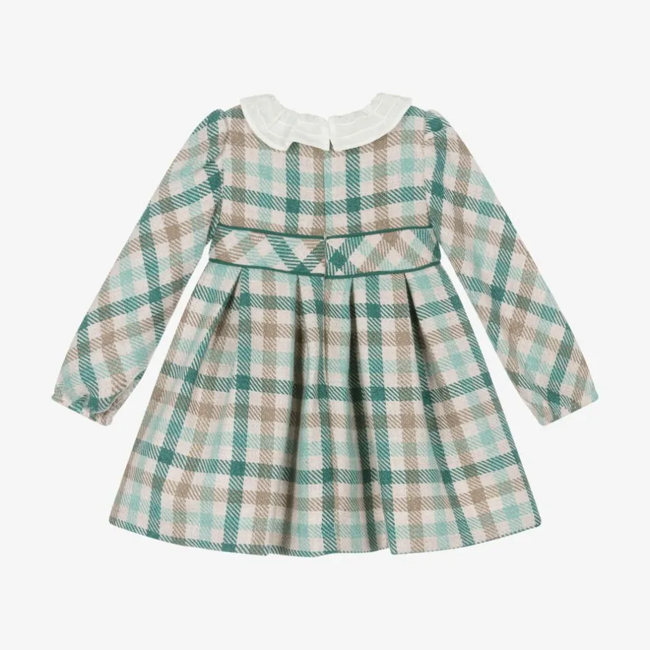 A green and beige check dress for little girls by Mayoral. Woven in a soft cotton and wool blend with a subtle gold sparkle, it is lined with lightweight cotton for added comfort. The waistband has a pretty appliqué bow with branded detailing and green piping for a sweet look. Fastening with a concealed zip on the back, it has a white frilled collar and puffed long sleeves with stretchy cuffs for extra comfort.