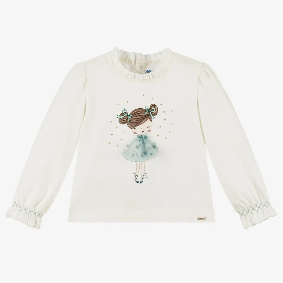 Pretty ivory top for little girls by Mayoral, made from soft cotton jersey. There is a charming ballerina design printed on the chest with green floral tulle trim and sparkly gold dot details. Fastening with poppers on the back, it has puffed long sleeves, a high frilled neckline, shirred fluted cuffs, and a logo-engraved charm on the hemline.
