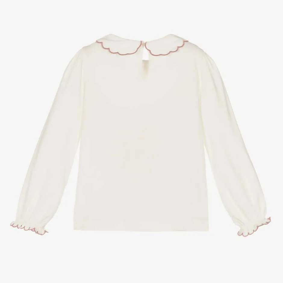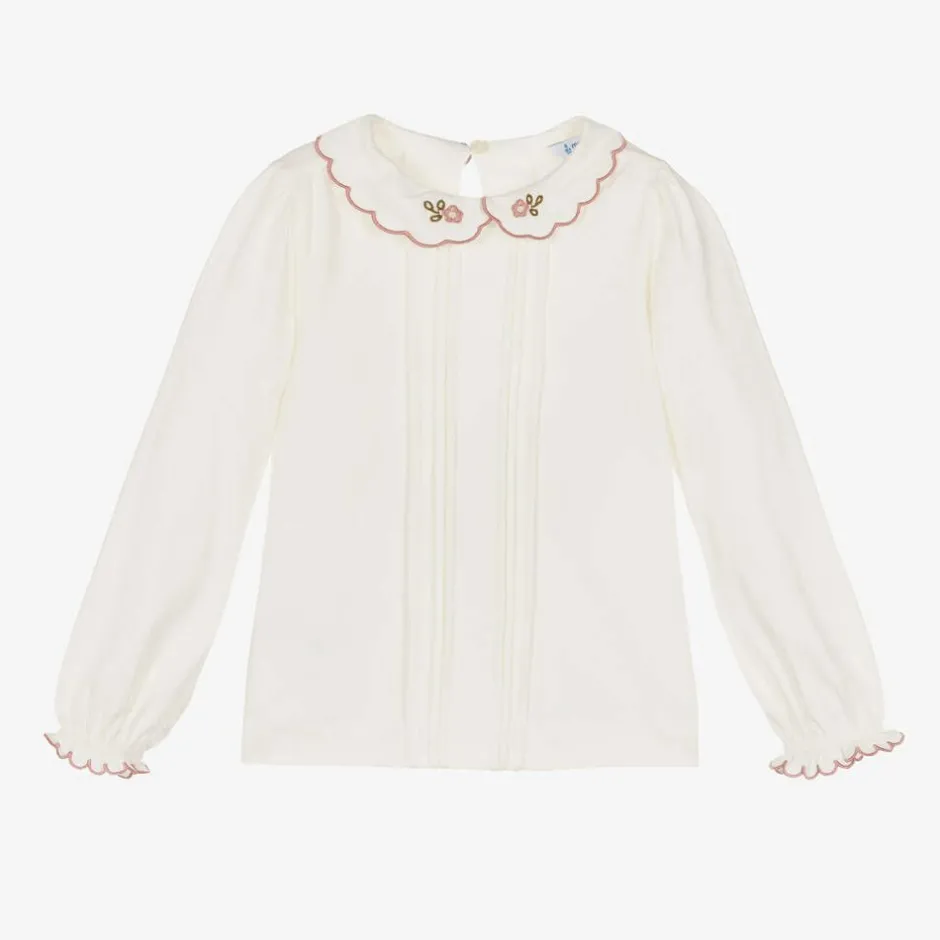 Ivory blouse for girls by Mayoral, made in soft and comfortable cotton jersey with a brushed feel. It has a sweet scalloped collar trimmed with pink edging and pretty pink and green floral embroidery. There are neat pintucks on the front and gently puffed long sleeves with elasticated cuffs and matching pink scalloped edging. It fastens neatly on the back with a single button.