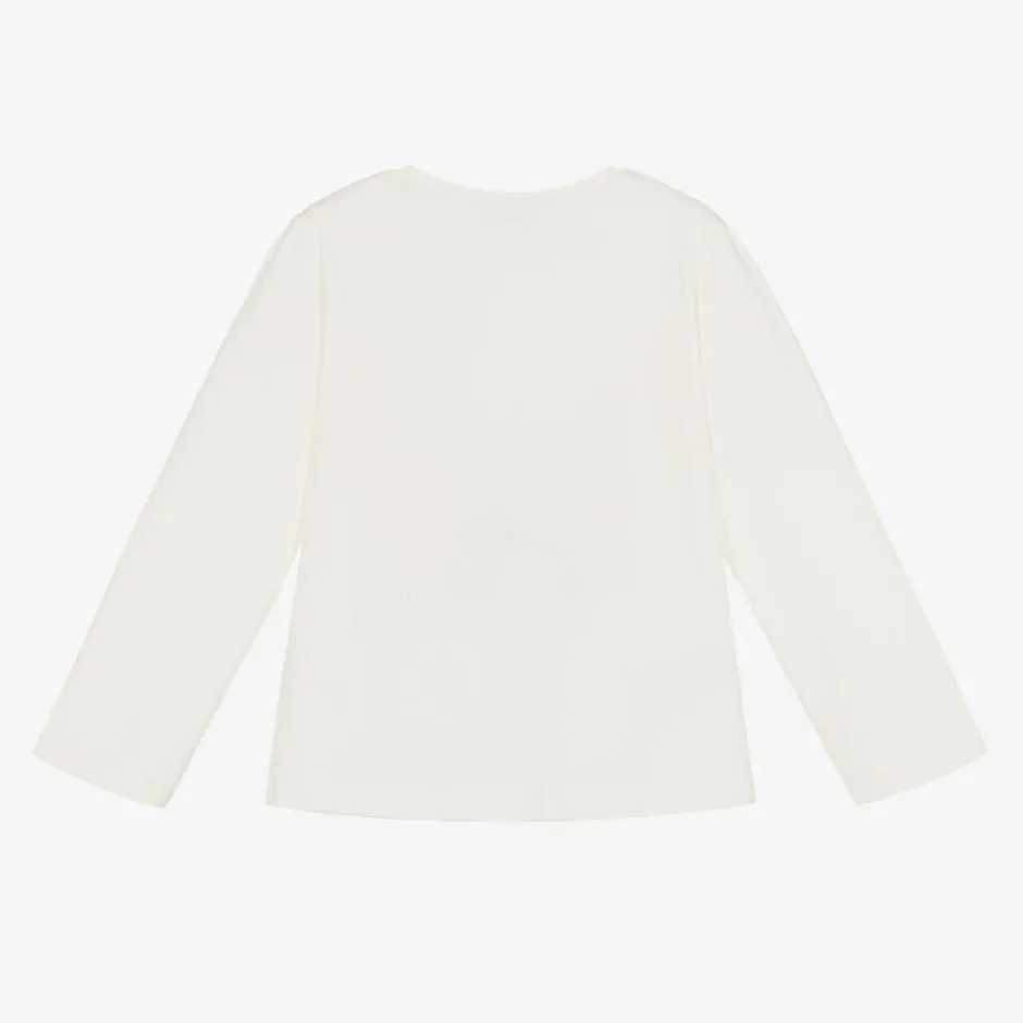 Cute ivory cotton long-sleeved top for girls by Spanish brand Mayoral, made in comfortable jersey. It has a girls-in-the-rain print on the front in blue and beige, shimmering with sequins and shiny gold.