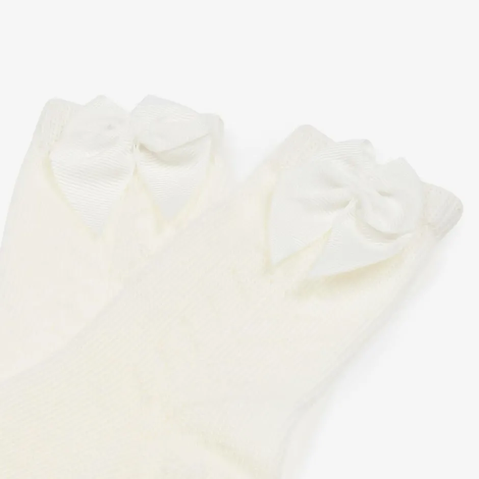Ivory socks for little girls by Mayoral, knitted in a soft cotton blend. These knee high socks are decorated with lacey chevron patterns. They have grosgrain bows on the cuff for a pretty touch.