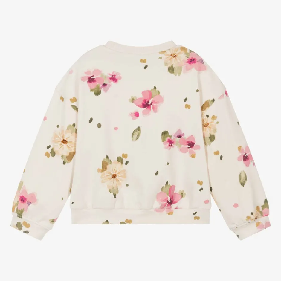 A pretty, lightweight sweatshirt for girls by Mayoral, in ivory with a pink and beige floral pattern. It is made in soft cotton jersey with a relaxed, boxy fit, dropped shoulders and long sleeves. Designed to sit on the waist, the ribbed hem has a lovely tie detail at the front.