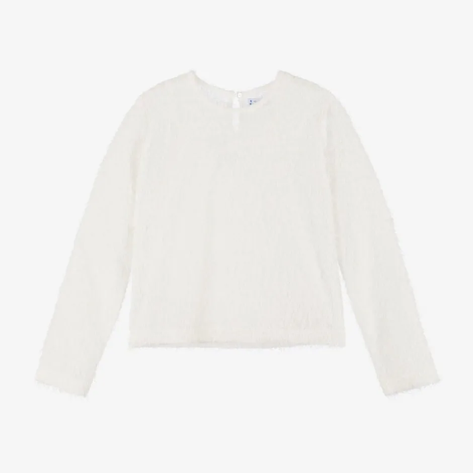 Pretty ivory long-sleeved top for older girls by Mayoral. Soft and stretchy, it is made in a lightweight knit with a fluffy look and silver threads for added sparkle. It has a single button fastening on the back. This versatile top comes with a cotton jersey camisole, which can also be worn separately.