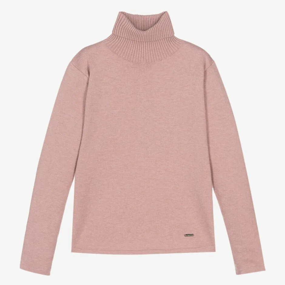 Dusty pink roll neck sweater for older girls by Mayoral, knitted in a soft cotton blend. Cosy and comfortable, with a classic ribbed roll neck, it has a metal logo bar by the front hem.