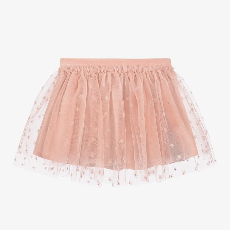 Dusky pink tutu skirt for little girls from Mayoral, layered with lightweight tulle for a pretty look. The skirt is covered with glittery silver and pale pink flowers. It has a stretchy velvet waistband and is lined with soft cotton fabric to ensure little ones feel comfortable.
