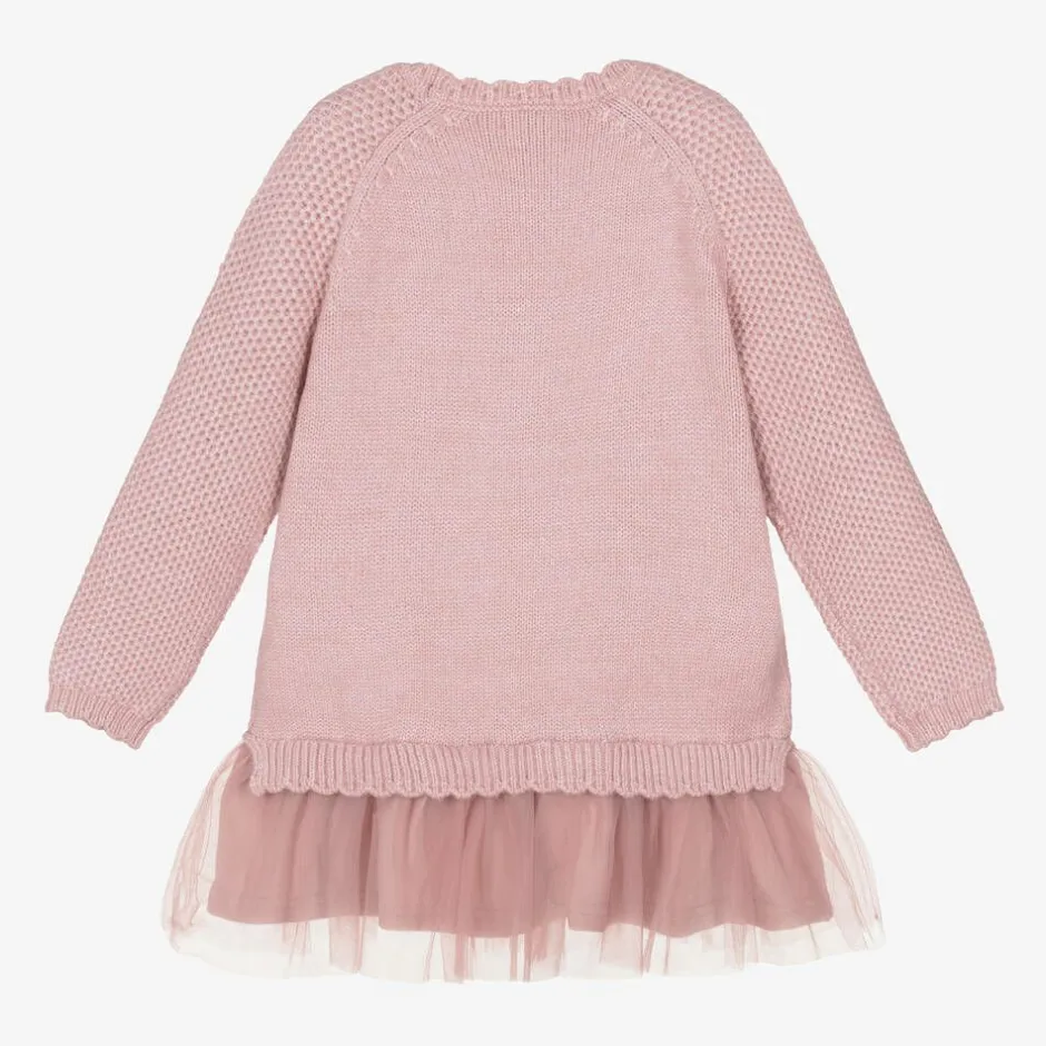 Pink dress for girls by Mayoral, made in a soft knit with added silver threads for a touch of sparkle. The long-sleeves have a honeycomb pattern and there are sweet scalloped, ribbed trims. Made in layers of soft tulle, the dropped hem has a cotton jersey lining and for a pretty finish, there is an embroidered floral design on the front. This item contains recycled fibres.