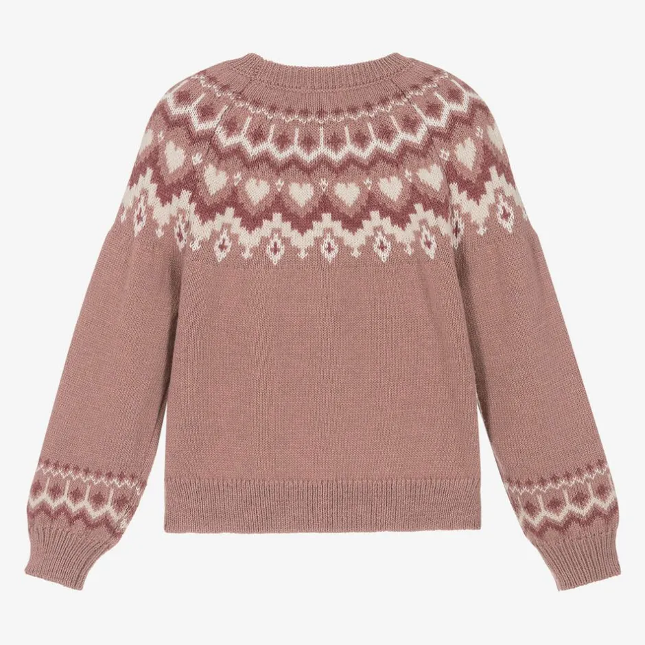 A lovely pink jumper for girls by Mayoral with a Fair Isle pattern in shades of pink and ivory. Softly knitted with a touch of wool, this cosy style has a crew neck and raglan sleeves.
