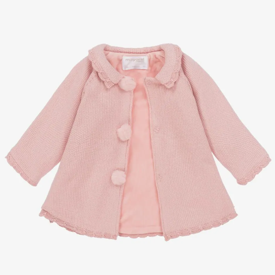 Pink pram coat and hat set for baby girls by Mayoral, knitted in a soft cotton and viscose blend. Keeping little ones warm and snug, this adorable layer has scalloped trims and faux fur pom-poms on the front. It has a beautifully soft velour lining, a classic collar and concealed popper fastenings. The matching hat has a cute pom-pom on the top and easy tie fastenings that secure comfortably under the chin.