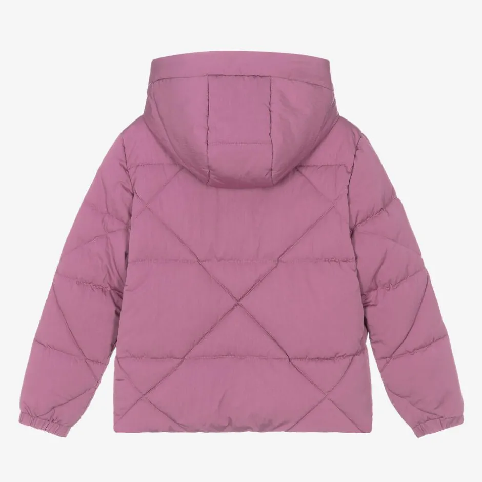Mauve purple hooded jacket for older girls by Mayoral, made in lightly textured, quilted fabric with a soft polar fleece lining. Ideal for the colder months, this padded outerwear piece has a full-length zip and decorative drawstring ties on the neckline. The front pockets are fleece lined and the cuffs are gently elasticated for added comfort. Toggle fastenings on the hem give the option to tighten or loosen the fit.