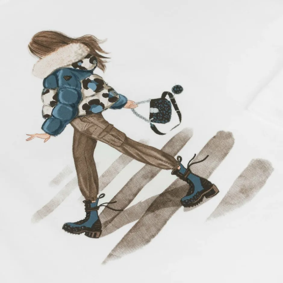 White long-sleeved top for older girls by Mayoral, made from soft cotton jersey. In a casual style with dropped sleeves and a rounded neckline, this comfortable top has a cool, girl graphic on the front, printed in shades of blue and brown.