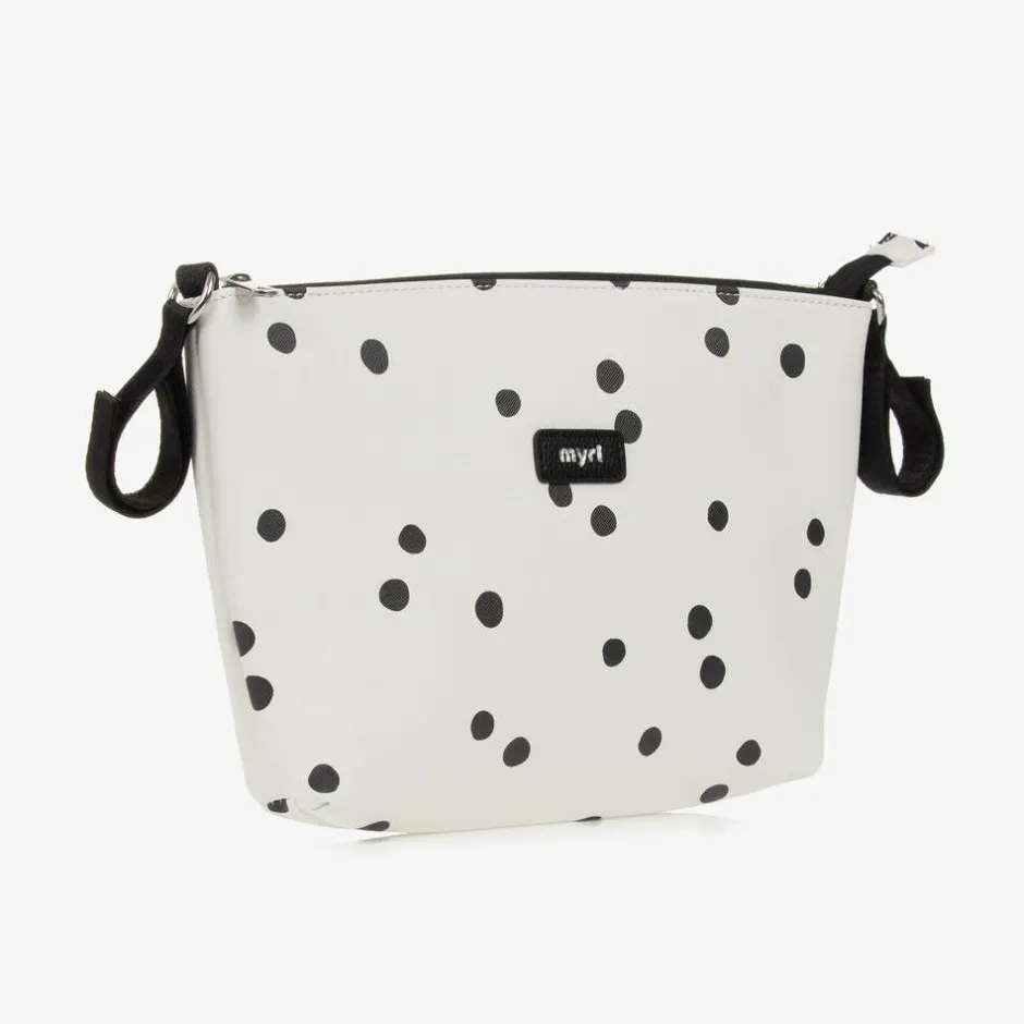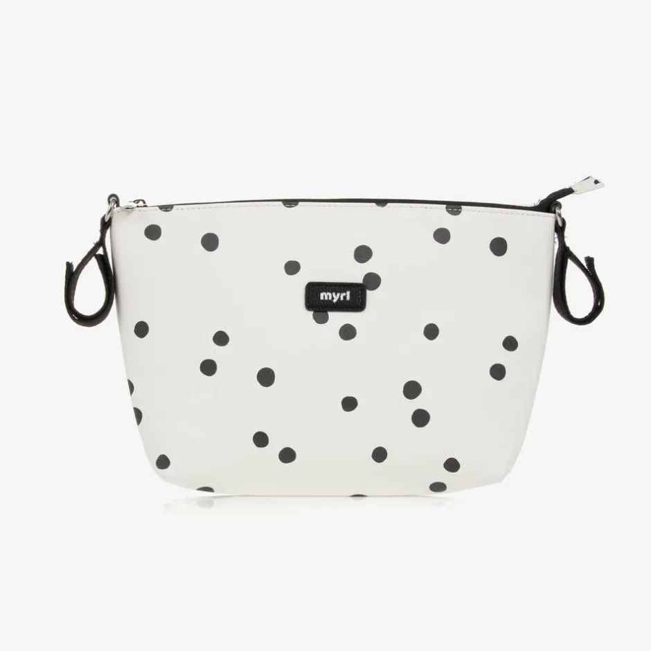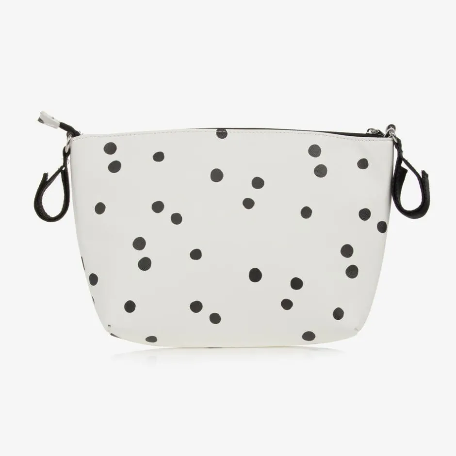 Stylish ivory stroller bag by Mayoral, made in soft faux leather. It has a black spots print, with a logo patch on the front. This practical bag has a zip fastening main compartment with two inner pockets and a separate section to store baby bottles. There are adjustable, velcro fastening stroller straps for an ideal fit.