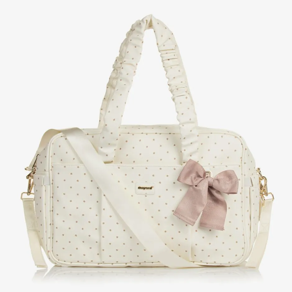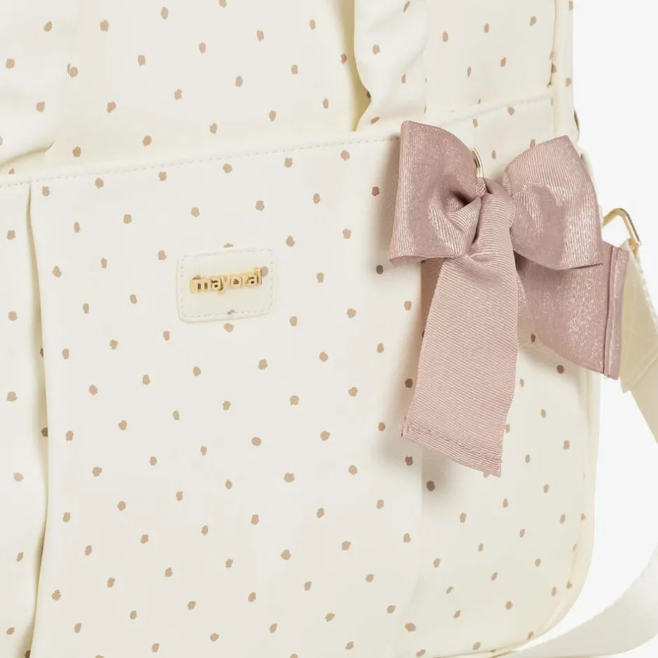 Pretty ivory changing bag by Mayoral, made in soft faux leather. It has a sweet beige polka dot print, with a gold metal logo and glittery beige bow on the front. The spacious main compartment has internal pouch pockets for organising belongings, and fastens with a secure zip. It has fixed, ruched carry handles, a shoulder strap and detachable stroller straps for versatile wear. There are pouch pockets on the sides, ideal for storing bottles and a further external pocket on the front.