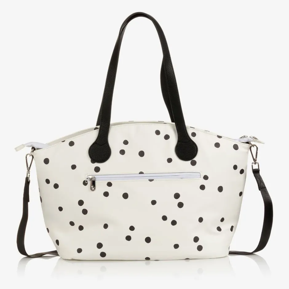 Stylish and practical ivory changing bag by Mayoral, made in soft faux leather. Patterned with black spots, it has a cute teddy bear appliqué on the front. The double zip fastening spacious main compartment has a silky lining and seven internal pockets. There is a comfortable detachable shoulder strap and stroller straps for ease when travelling. It comes with a matching lightweight and easy-to-clean changing mat.