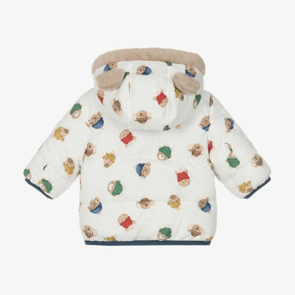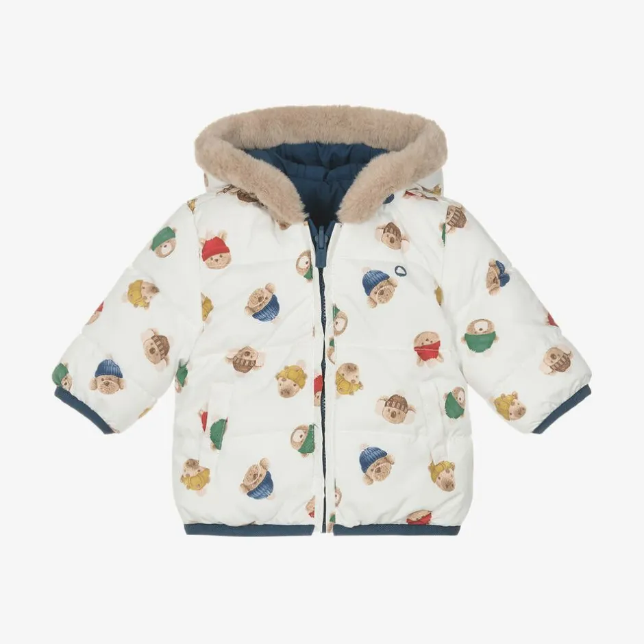 Cosy and comfortable for baby boys, a softly padded reversible coat by Mayoral. The navy blue side has a colourful logo patch on the chest, with popper-fastening pockets on the front. The ivory puffer side is patterned in sweet teddies wearing colourful hats. This lovely zip-up coat has a fixed hood for added cosiness, trimmed in beige faux fur, and with cute little ears on one side.