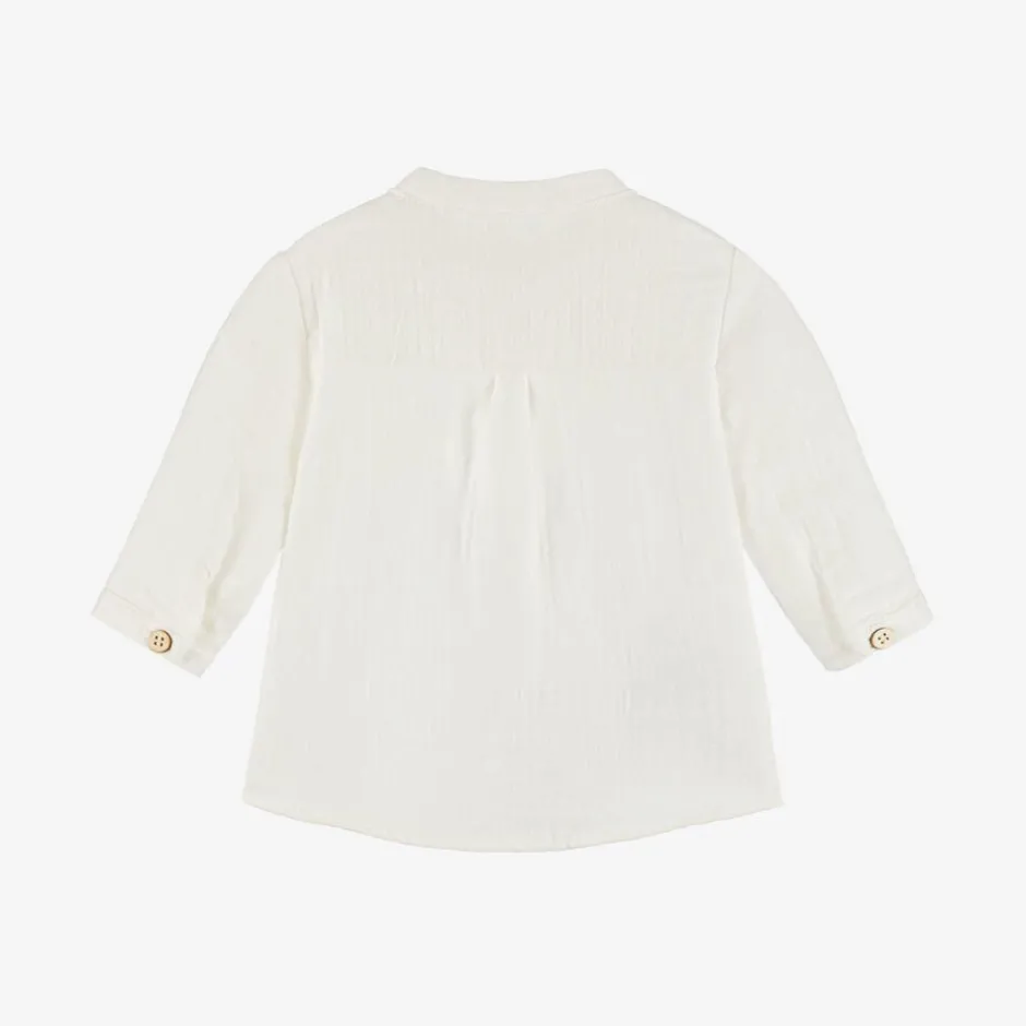 An ivory shirt for baby boys by Spanish brand Mayoral, made in soft and lightweight cotton with gentle slubs in the weave. This traditional, collarless style is ideal for a smart casual look with natural button fastenings on the front and cuffs. There is a faux chest pocket and a brown logo tab above the curved hem.