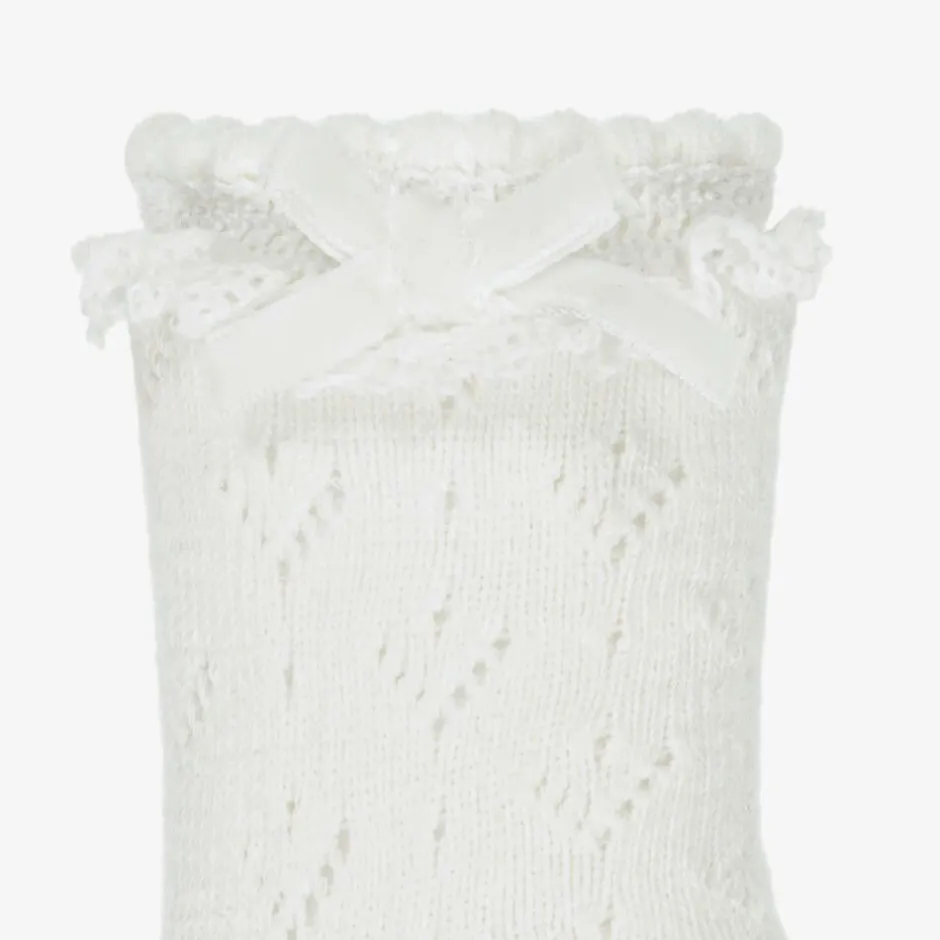 Pretty ivory socks for baby girls by Spanish brand Mayoral, with lace trims and little velvet bows around the cuffs. Made in a soft, cotton blend, they have a 'V' shaped pattern in the weave.
